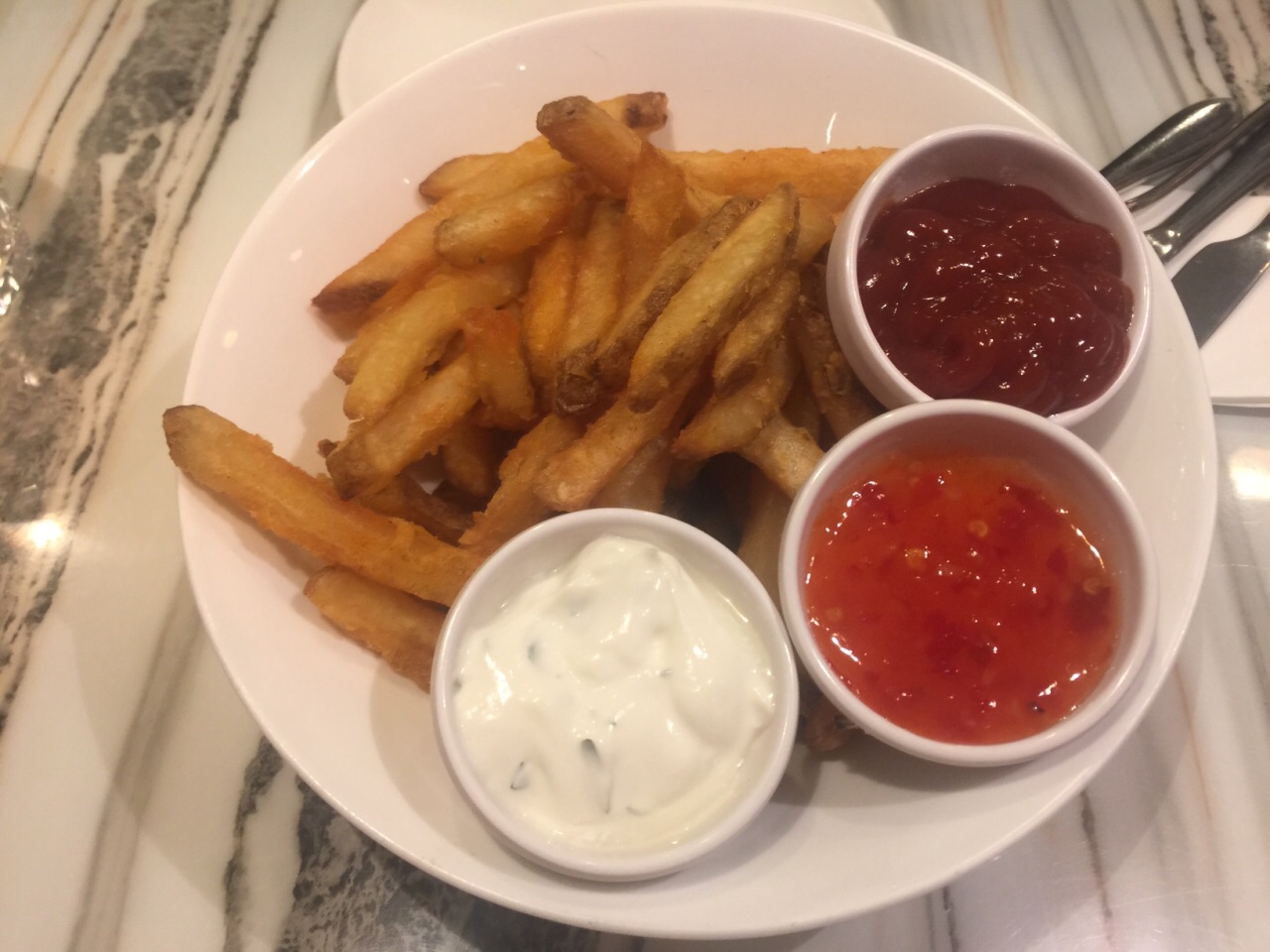 另外还有炸薯条、炸鸡翅等小吃可选,厚薯条分量很大,还配有三款酱汁可蘸,这点很好
