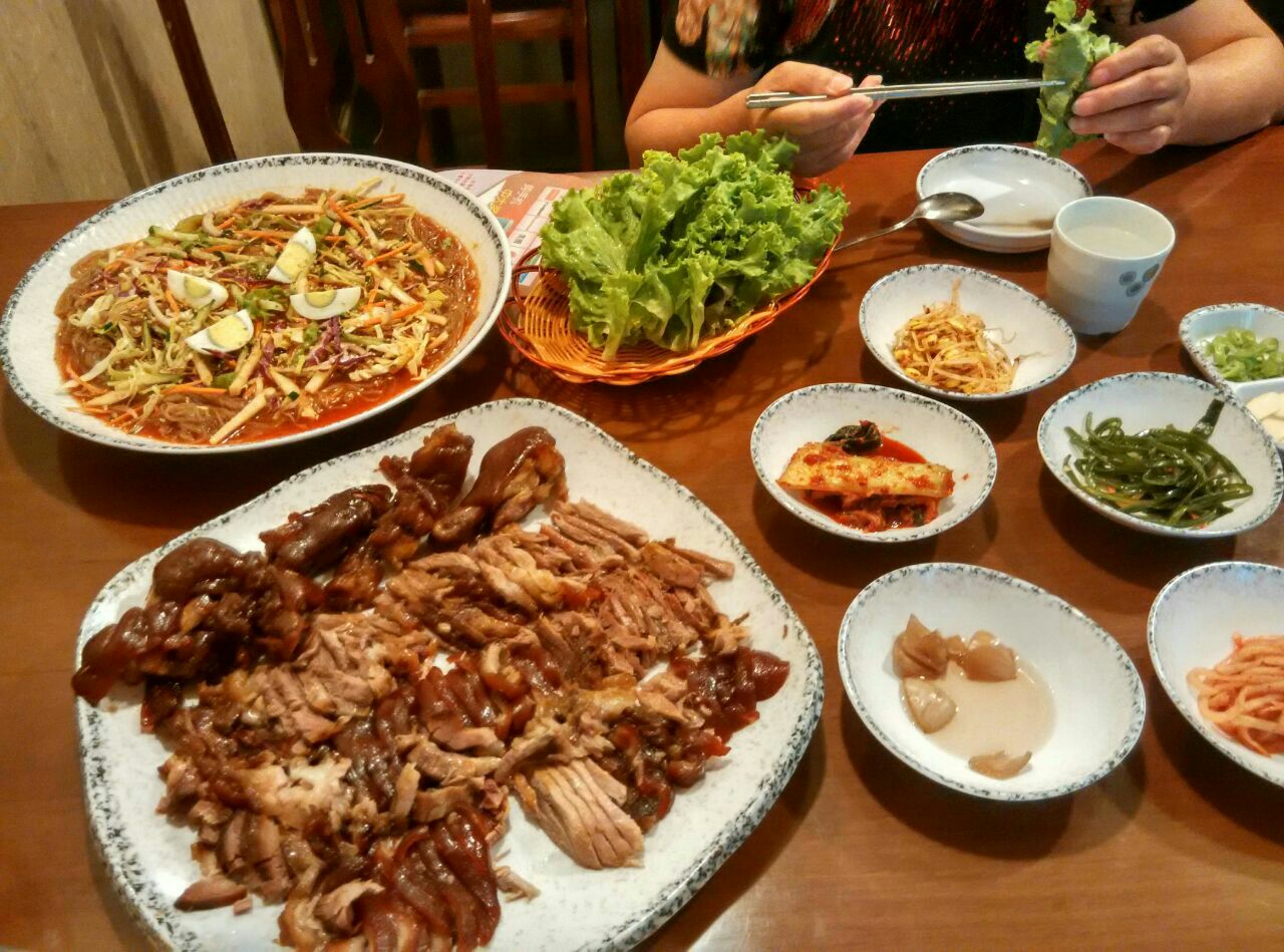 不是很好找的一家店,距离西塔小市场不太远,服务很好。说菜,所谓宝膳,是猪肘的料理,不加蘸料的话,只是原味猪肉味道,配上酱料变得很神奇,有化学反应一样,立马口味不同了。套餐里最大的比较划算,实在吃不下。拌冷面,只是还好,份量也特别大。酱汤不错,里面还有海鲜。
