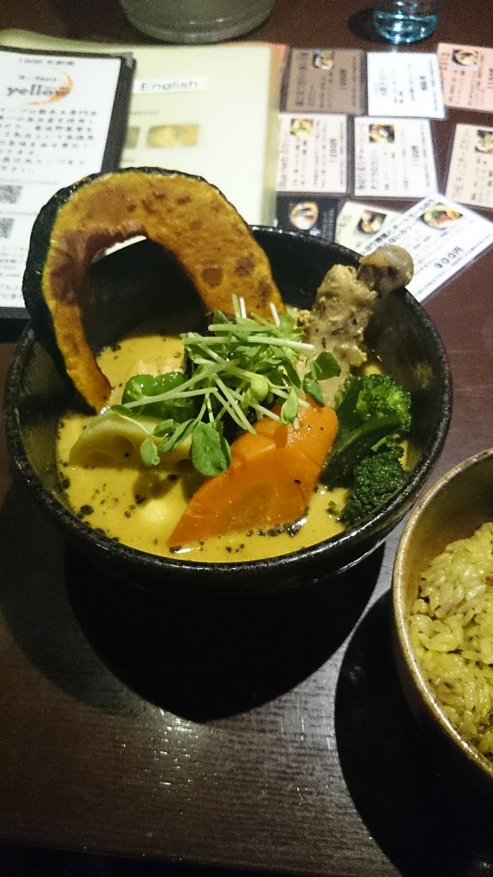 大雪的晚上从狸小路一路走过来。味道值得这趟颠簸。 有中文菜单,辣度可选,米饭分量可选。不知道吃什么好的话,推荐经典的鸡腿蔬菜汤咖喱,鸡肉酥烂,辣度我选的2,觉得微微辣刚好,大家可以往上试试。蔬菜都是烤过的,甜味出来了,很好吃哎。还推荐季节限定,我们去的时候是牡蛎限定,小伙伴吃的很舒服。冬天推荐大家来一份热乎乎的汤咖喱~