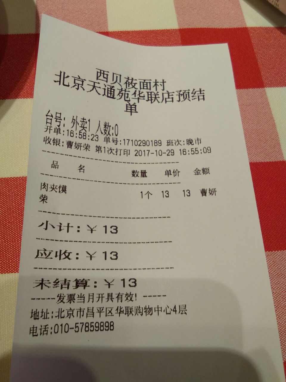 加餐想吃肉夹馍了,距离天通苑华联的西贝莜面村比较近,就决定来这儿吃肉夹馍了。到了四楼一看,有的商户已经换了,有的正在装修,真是大变样。只点了个肉夹馍。因为每天晚上五点以前厨师要开会,所以要等到散会了以后才能给我做肉夹馍。除了咸的老毛病以外,其他都不错。服务依然是非常优秀。