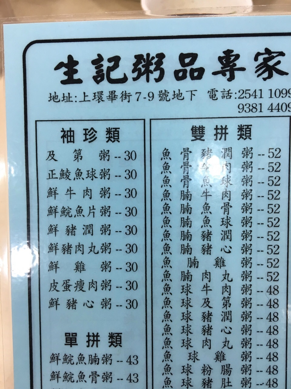 来生记吃过很多次了,最常点的是鲮鱼球粥,最常见的皮蛋瘦肉粥也不错,而猪润(就是猪肝)粥我认为则有一点点腥味。生记的粥是熬到米都快要化了,而且添加的内容全部都是现点现滚,所以端上桌时非常的烫,得一小勺一小勺地慢慢喝,若是赶时间的话,那可真有点捉急。女生的话,点个“细碗”就够了,份量都蛮大的。周日的话就不要去了,逢周日休息哦