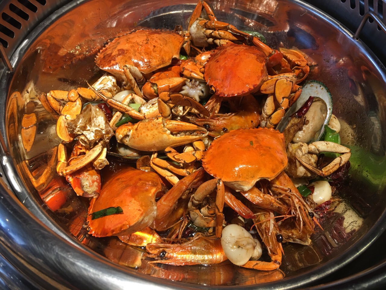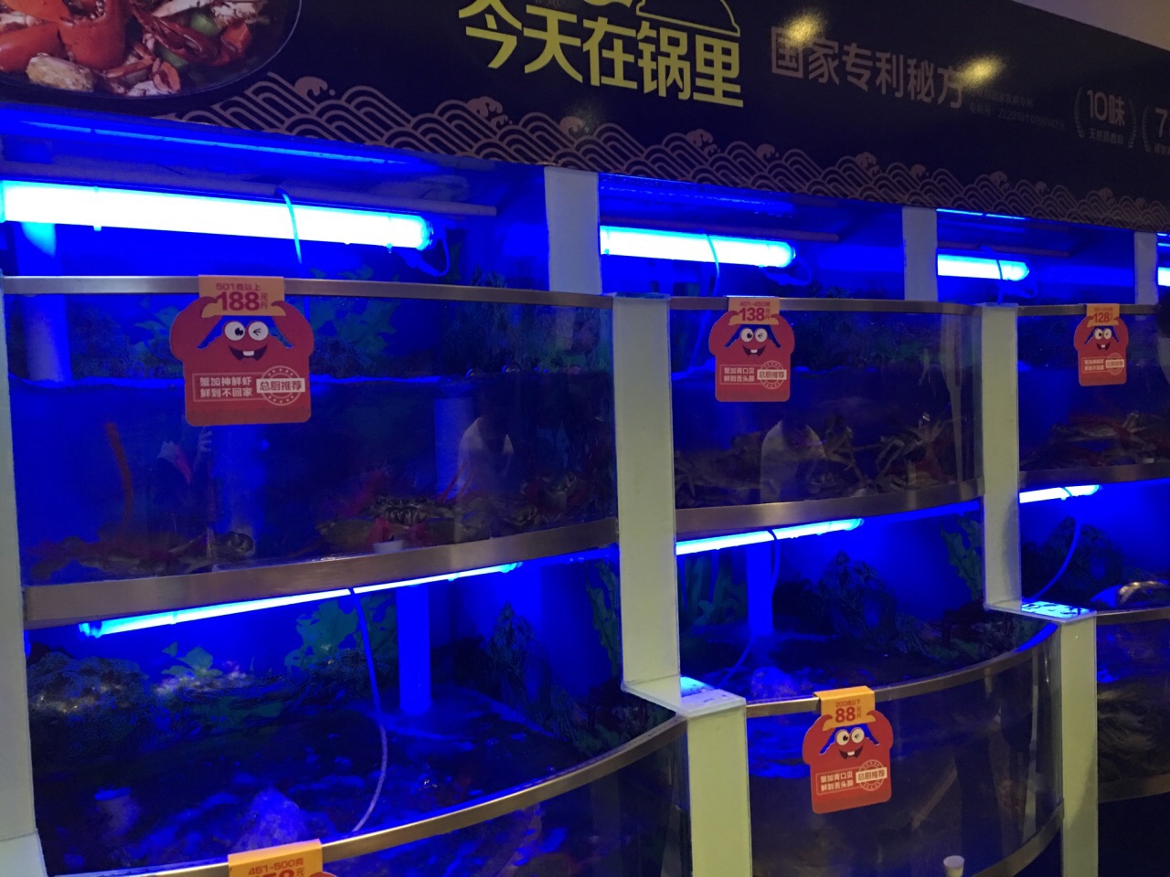小区门口看到他家7.8折的广告,礼拜天中午一家三口去拔草。在亿丰广场三楼,靠近观光电梯那边,楼下广场上就是一些小孩玩乐的游戏项目。 问了服务员,10月28日刚开张,全场7.8折,活动有可能搞一个月左右。整体环境看上去很整洁,座位都是一个个小包间隔开来的,相对私密。 落座之后服务员会带你去选蟹,都是活的青蟹,按不同大小不同价格论斤卖的,我们挑了4个98元一斤的,不过那个分量没母的,只有公的。我们还加了¥68的墨鱼仔,¥88的大虾,¥38青口贝小份各一份,还点了一些火锅配菜,那个是用平板点的。小菜、水果、调料、指定酒水¥5/位,酒水免费畅饮,这个挺不错。吃蟹有一次性手套,不过我们没用,喜欢直接手拿。点了微辣的,蟹的味道很赞,美味可口,每桌都有一个夹核桃的钳子可以用来夹蟹的两只大钳。虾很大个,很香,不过量不多,只有7个左右,墨鱼仔量还行,肉质非常的嫩,口感也好,青口贝也可以,吃的意犹未尽,非常满足。蟹吃完了还可以叫服务员加汤当火锅底料涮菜吃,那汤很鲜美,金针菇涮过之后还带股鲜味,真是一锅两吃,赞! 服务态度也很热情很到位,时不时的过来给我们换骨盘,他们要吃午饭了还跑过来每桌打招呼,问需要什么哇,有需要就叫他们,他们在一旁吃午饭了。 三个人打折下来吃掉¥370左右,不打折的话吃蟹还是有点小贵的,但是味道好,因此还是蛮吸引我的,下次还会再去。