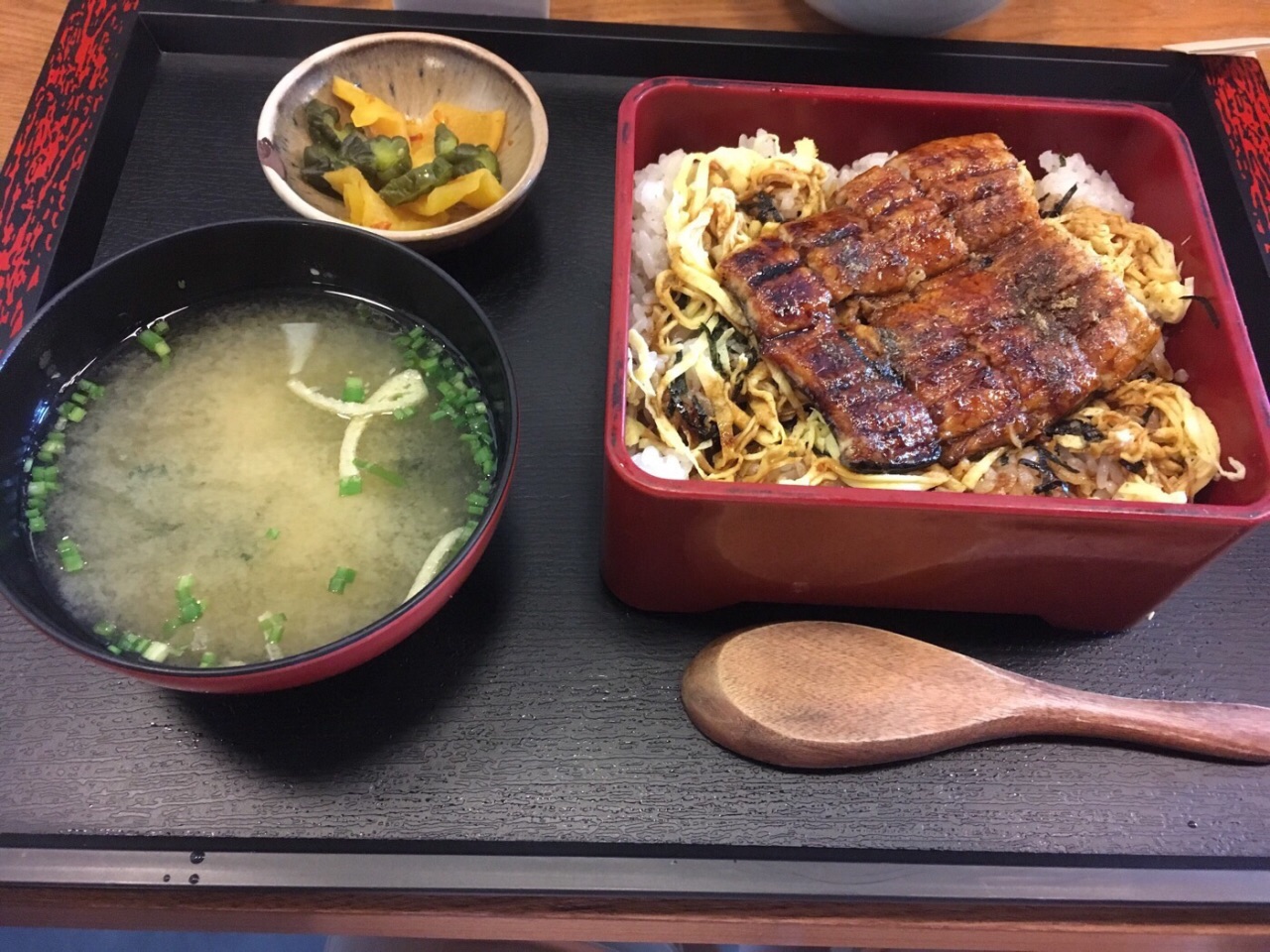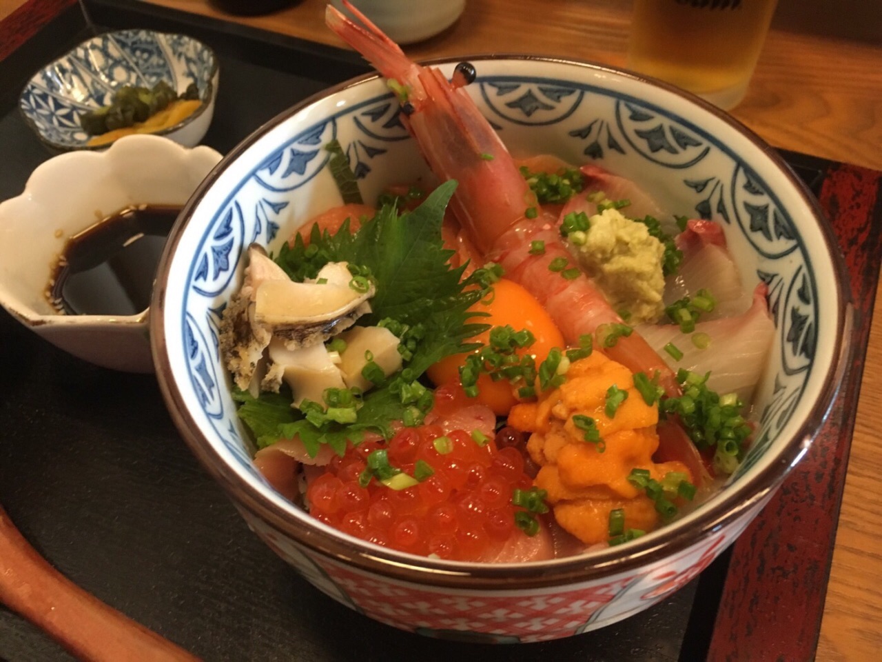 终于明白为啥订座要下午1点以后的时间,因为中午排队…不过好在大家动作都很快,换桌率很高! 纠结了半天,还是点了鳗鱼饭,四块鳗鱼,都是比较中段的位子,稍微有刺,口味还不错!酱汁给的比较多,所以饭也很好吃! 中午基本都是套餐,送味增汤,稍微淡了点。还有色拉,色拉给的是醋,也蛮好吃!还有小黄豆和豆腐皮,不错! 豪华海鲜饭,料很足啊!有鲍鱼,牡丹虾,各种鱼的刺身,还有鱼子。价格也很美丽,188。 天妇罗,不太油,但是还是不怎么很喜欢! 有免费湿巾纸和餐巾纸,这个不错!