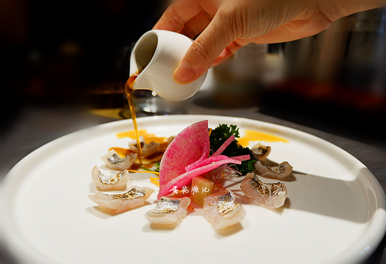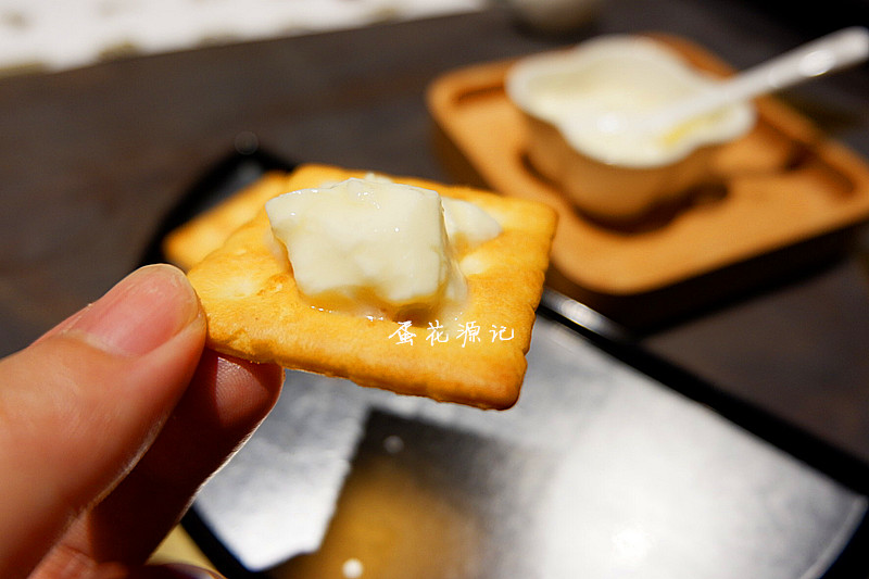井福渔炎——井福日料的升级版日料餐厅。选址也符合其定位,坐落于上海最奢华的恒隆广场内。不仅在菜品上做了升级和丰富,还有很多的店内自制和女士特选。几乎是上海品种最全的日料餐厅了。品这里的清酒前可以选一个自己喜欢的杯子,每一款都是老板娘精心挑选亲自从日本带回,都好美腻,为清酒锦上添花,让蛋花挑选的时候犯了了纠结症~ 颜味俱佳的下酒菜九品!这九款分别为醋味发菜、鲨鱼软骨+飞鱼籽、猪肉味噌黄瓜、辣味明太子、味噌芝士、酸甜小番茄、鱿鱼丝+海苔丝、芥末章鱼和鸭胸肉+土豆泥。摆盘精美,看似每一小口,却充满惊喜,芝士和猪肉上面的味噌酱都是店家自制的,创意十足。醋味发菜和小番茄都略带酸甜,一口不过瘾。鱿鱼和海苔都切成了丝儿状以后碰撞出了新的火花,美妙无比。很多小伙伴想必也是和蛋花一样第一次听到,原来带鱼还能生吃。选用长崎四指宽的带鱼,这个宽度的肉质不柴,最佳,适合做刺身。在喷枪的烧灼下,淋上秘制柚子醋,边微卷起,呈金黄色泽,此刻入口正好,没有料想中的会有腥味,只留鲜香与口中。可佐以清酒食用。 名物牛肠,即使跟蛋花一样不敢吃牛肠的亲也不要错过这道菜,真的非常地糯滑幼甜,却一点也没有肠子的腥味,沾上蛋液口感更佳,容易下咽,也是佐酒佳品。 重头戏肯定是这款,又要说到女生最爱的自制奶油乳酪饼干了。第一次去井福时没有吃到,二次来到渔炎享用到了,真是我的福地。蜂蜜搭配店家自制奶酪,十足的创意呀~关键不厚不腻,而是如布丁般弹滑,各中滋味,只有你来店里细细品味啦~