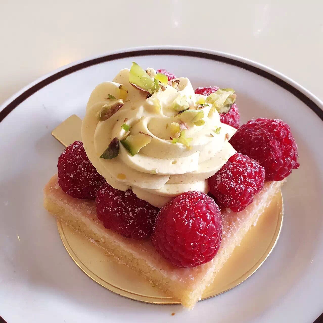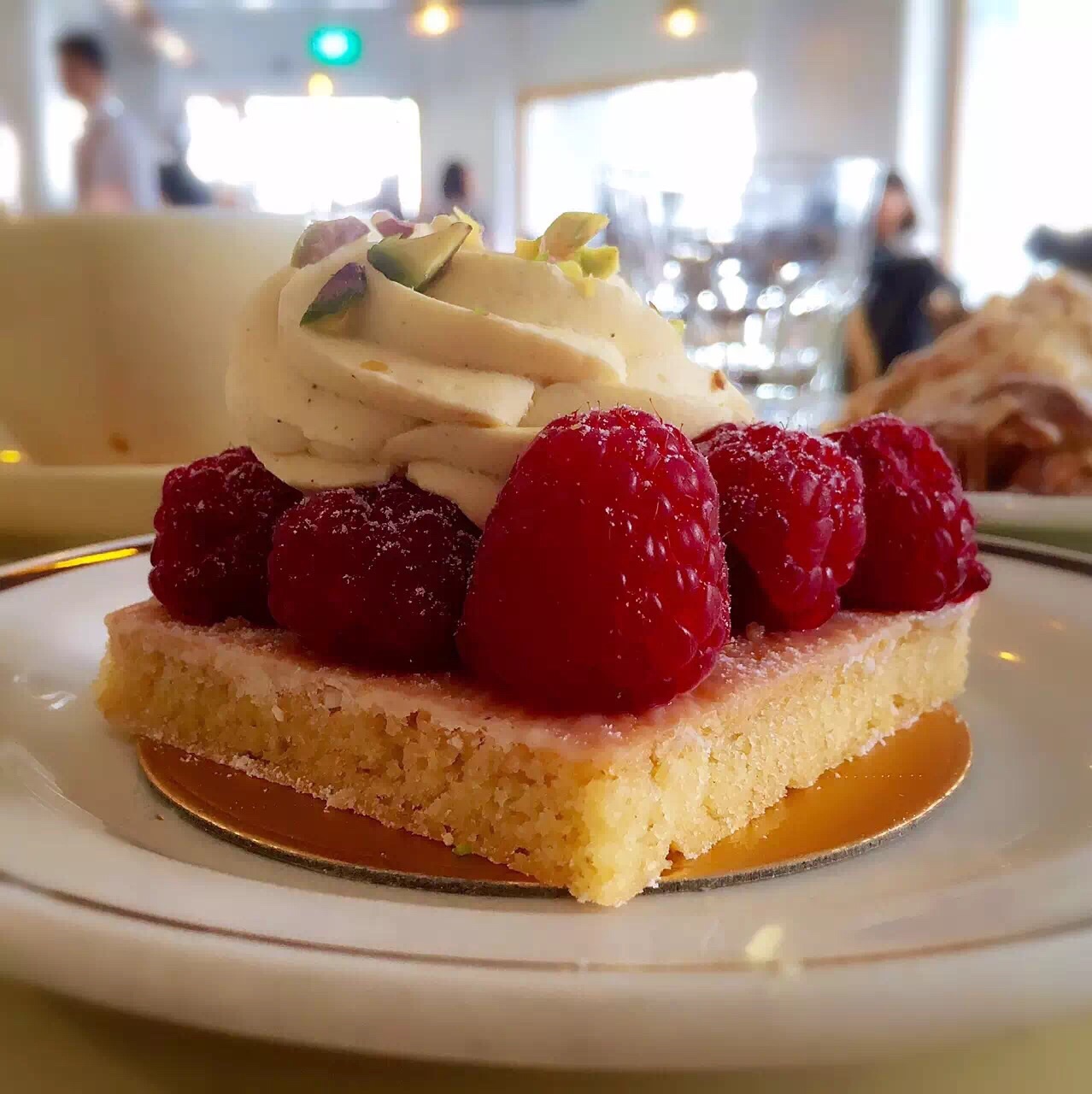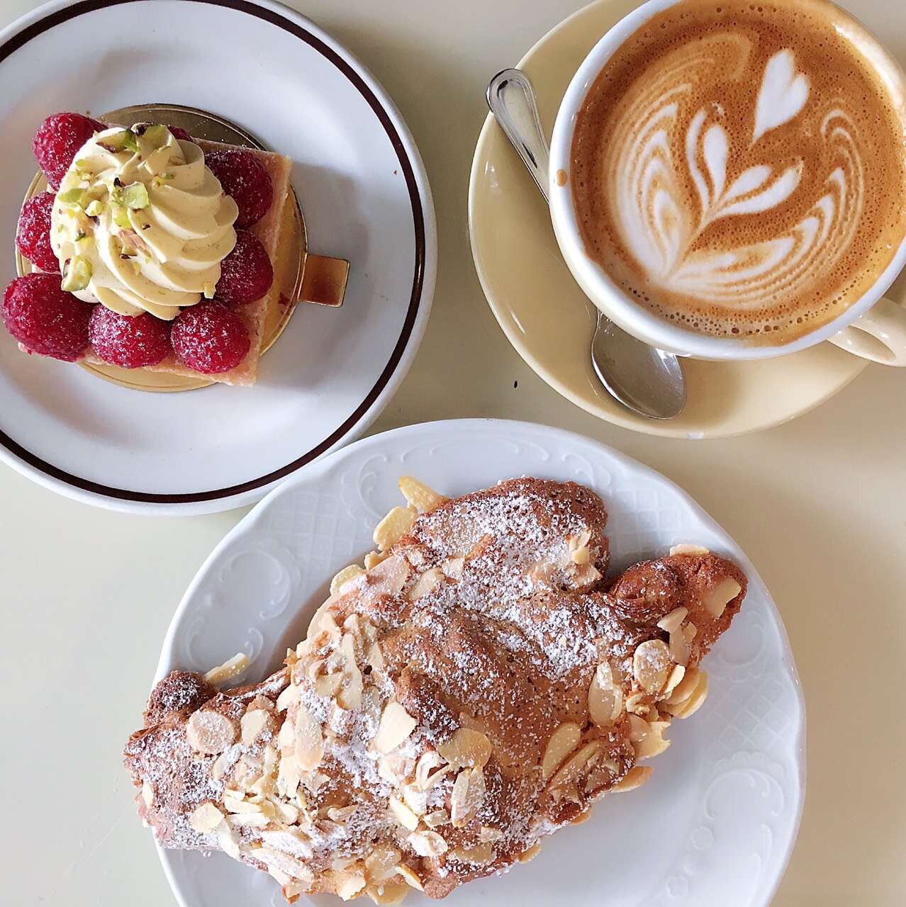 新加坡最好吃的可颂!超喜欢杏仁可颂和杏仁抹茶可颂,4新币很一大个。对半切开,是一顿早餐外加一顿宵夜的量。绵软的内层和酥脆的外壳,用微波炉加热更好吃! 树莓挞酸酸甜甜,8个撒上了糖粉的树莓围住了里面的自制莓酱,上面还挤上了香草奶油,点缀了开心果碎。