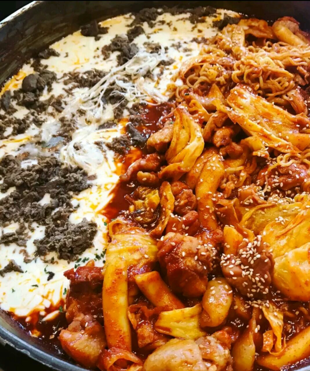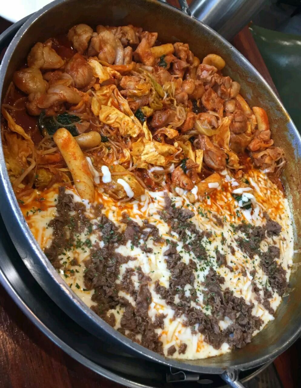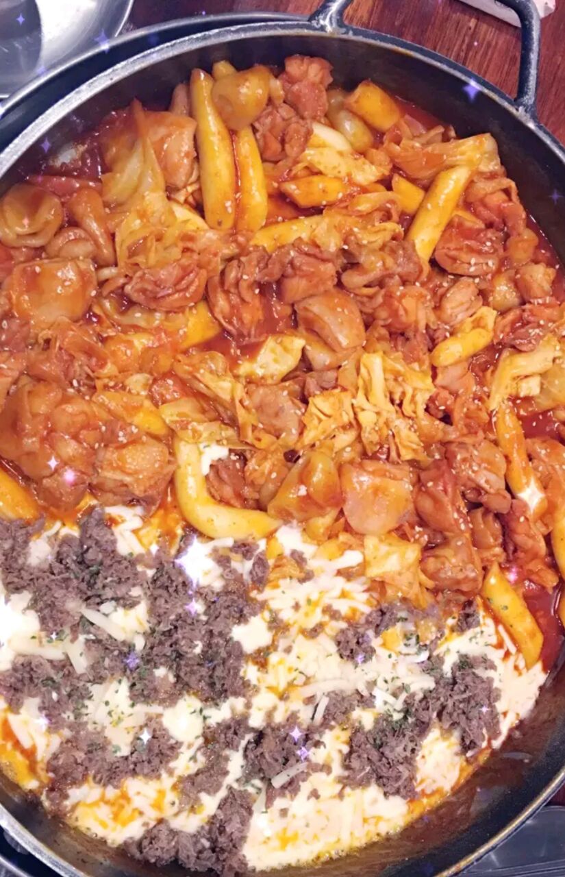 芝士控必去的一家店了! 看上去很大的一锅,上来也确实让我们惊艳了。 不过实际上锅子挺浅的,也蛮好理解的,毕竟好多的芝士呢! 鸡肉都是事先调过味道的,挺嫩的口感,吃到后面感觉芝士比鸡肉的量还多了多了!辣白菜的口味不大好吃,剩下了。