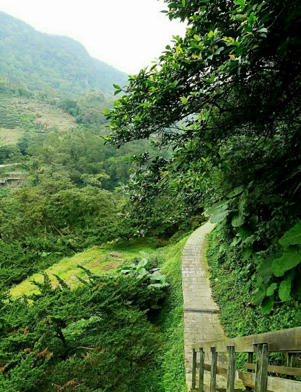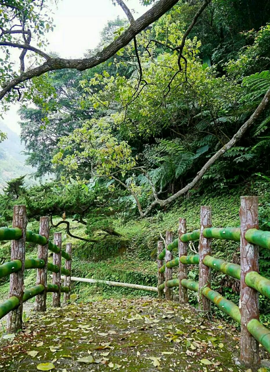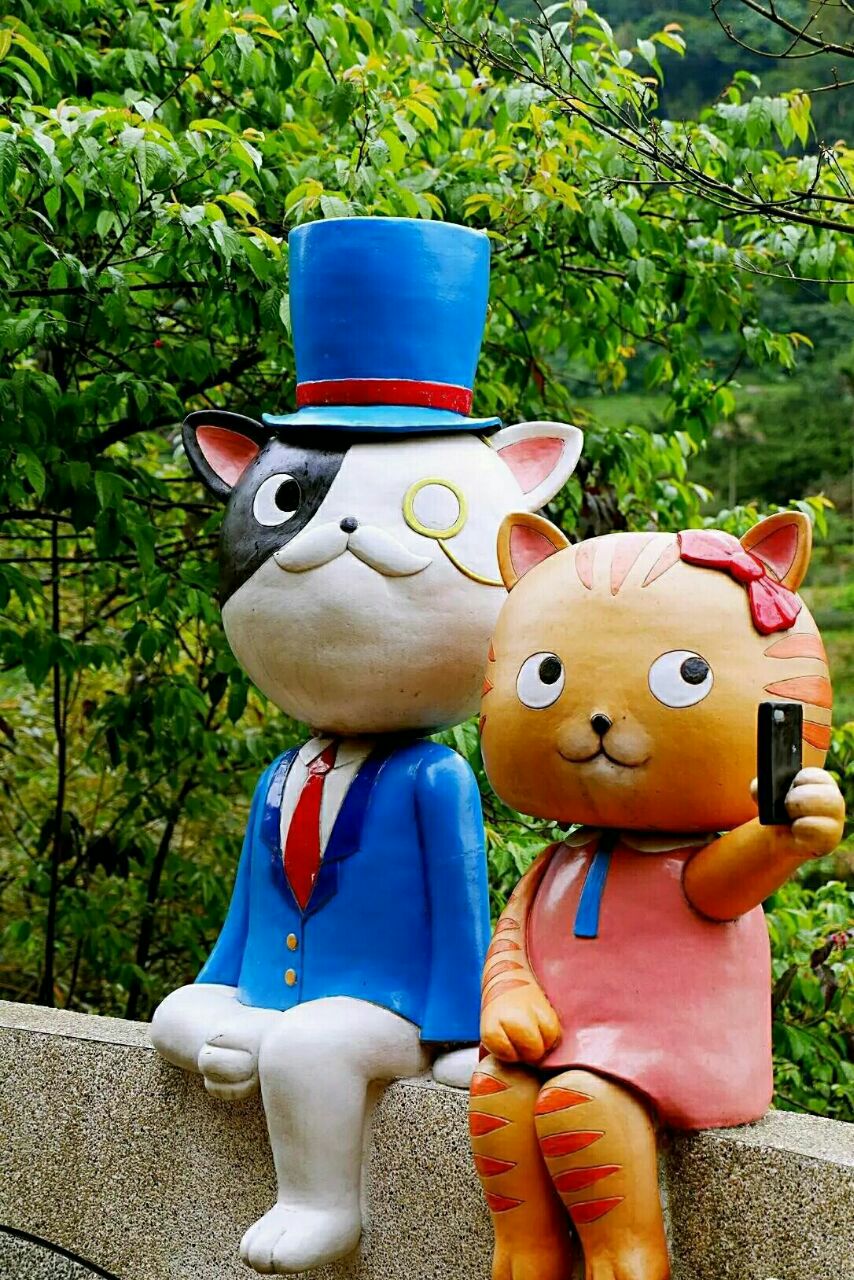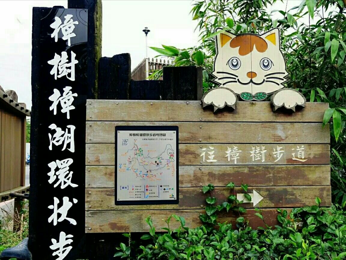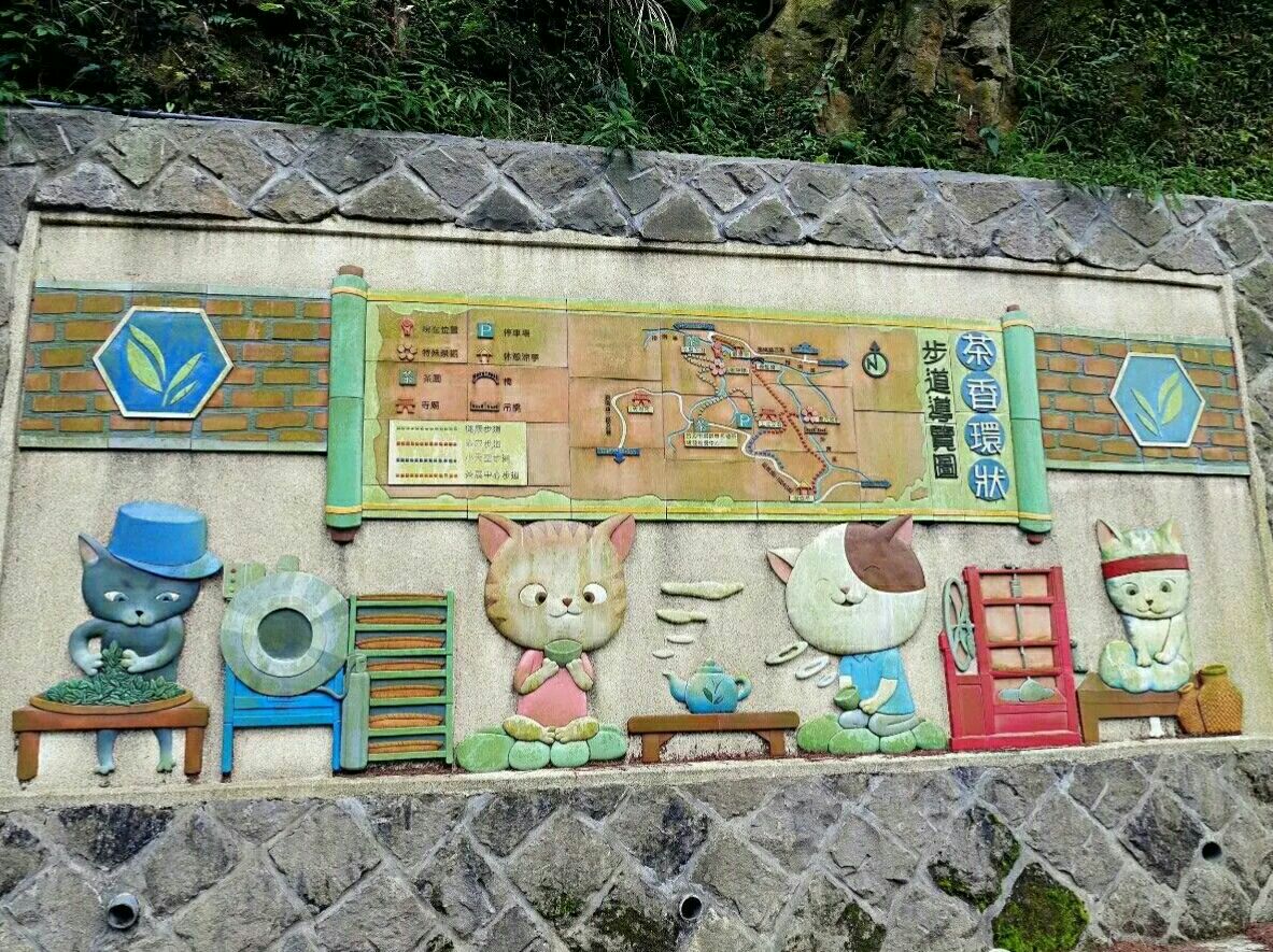 猫空樟树步道是台北附近比较热门的健身步道,步道入口处老远就看到大脸猫,好像是在等待把你唤入山中健步道,漫步于健身步道的小径中,步道沿山势曲折蜿蜒,盘旋,起伏。途中渐渐下起蒙蒙细雨,空气中弥漫着泥土的芬芳与茶香,呼吸着雨后清新的空气,踩着樟树的落叶,欣赏满山樟树林的秀美风景,步道两边不时地发现与猫有关的玩偶和雕塑,身心愉悦。
