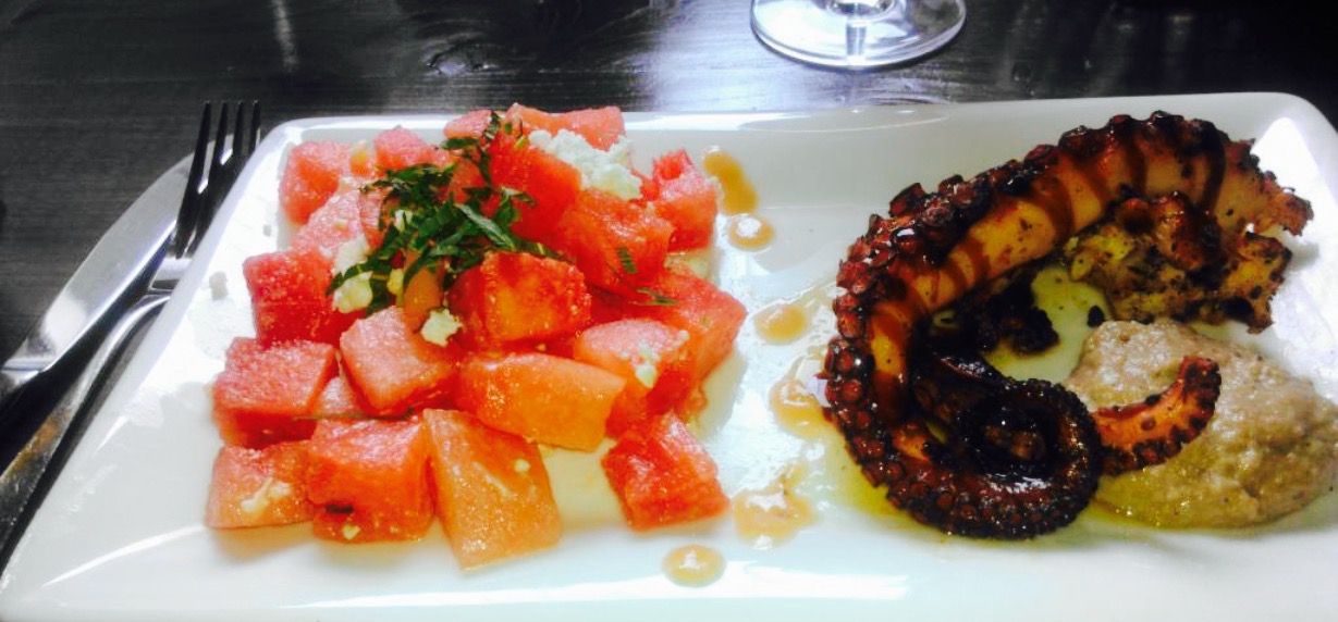 虾,鲈鱼,味道很鲜美,而且调料很入味听说这家餐厅很受欢迎,所以特来感受一下,我们点了西瓜沙拉,很新鲜。虾,鲈鱼,味道很鲜美,而且调料很入味。果仁蜜饼,巧克力蛋糕都是热销的产品,当然搭配一瓶红色的希腊葡萄酒就完美了。