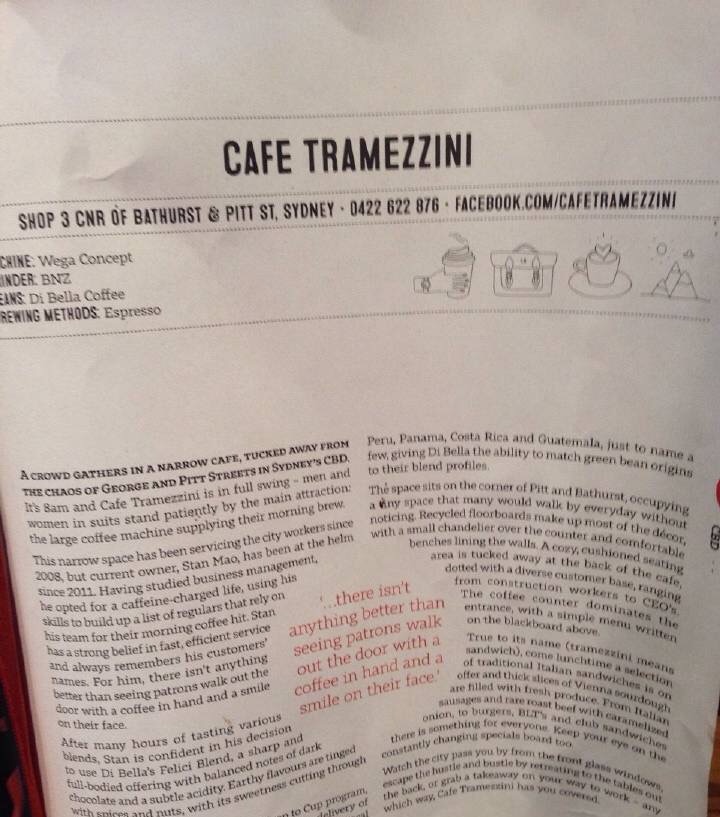 Cafe Tramezzini,挺文艺的咖啡店呢,悉尼倒是真的没有多少星巴克costa太平洋之...Cafe Tramezzini,挺文艺的咖啡店呢,悉尼倒是真的没有多少星巴克costa太平洋之类,都是这种比较文艺的小咖啡店