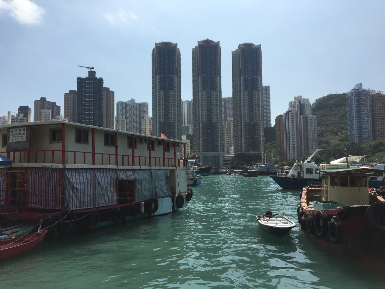 来到香港仔避风塘,完全不会觉得这里是“海”,与对岸的鸭脷洲感觉就是隔“河”相望而已。正因为这里像是一条伸入内陆的河流,正好可以躲过海上的风暴,成为一处避风良港。相比铜锣湾的避风塘,这里的居民更多些,而且在海港边,有一条长长的海岸公园,是居民们散步、晨跑的好去处