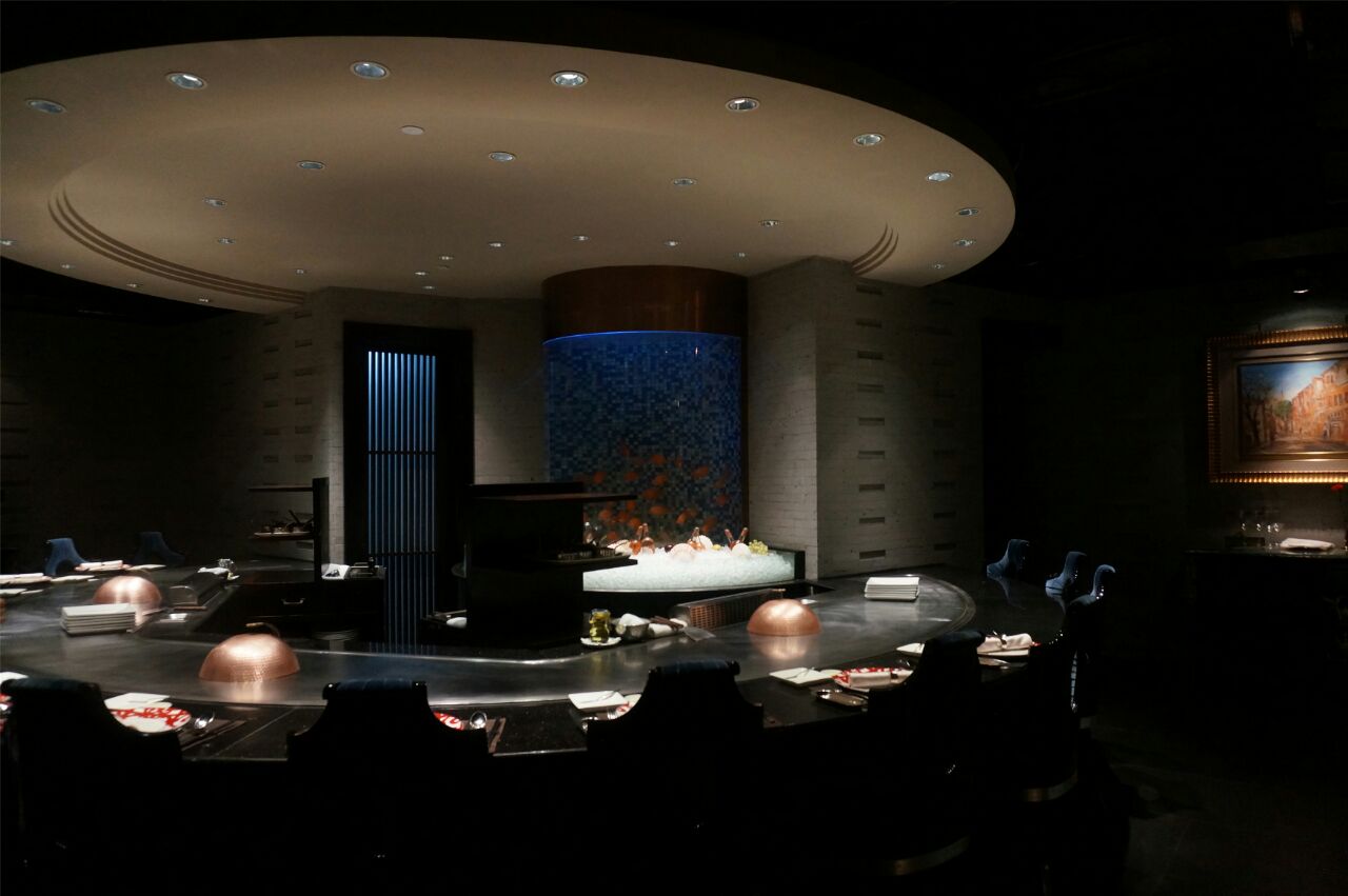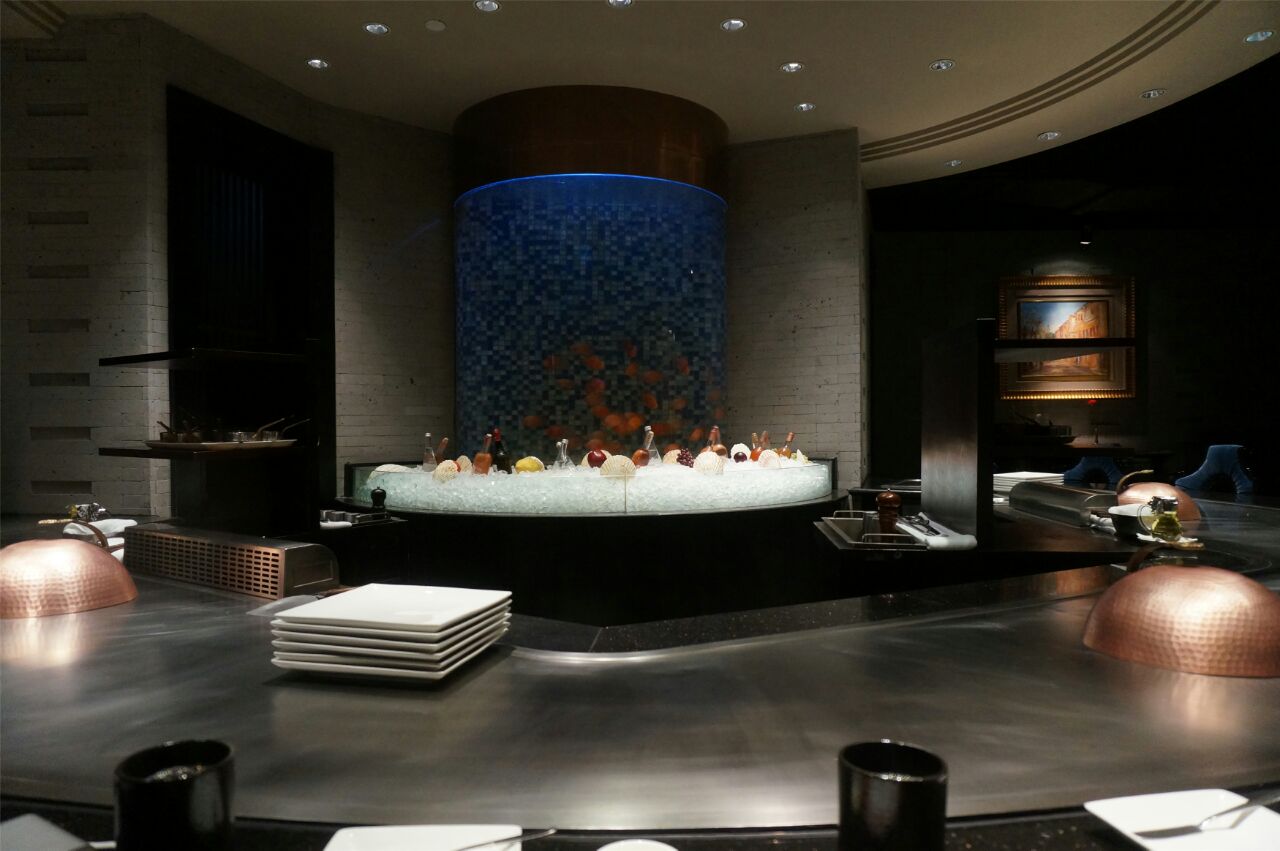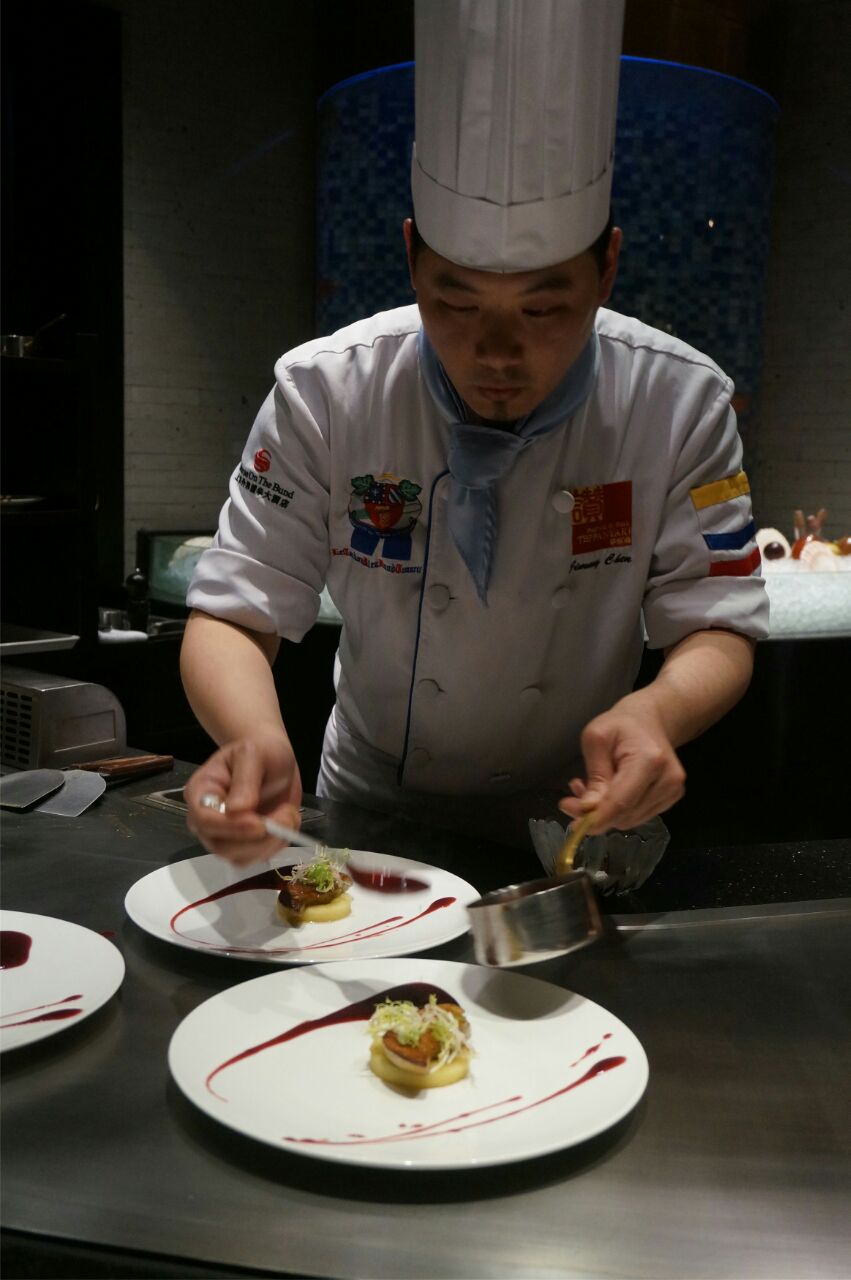 汤品&杂粮面包,杂粮面包有配黄油,汤品是四选一,阿拉要的牛尾汤,挺浓郁的。 法式前菜,底层是蛋糕,主要是慕斯,表层有鱼籽和鱼子酱,咸甜咸甜的。 铁板龙虾佐南瓜酱,主厨介绍龙虾都是活剥的,表层有芝士,配的南瓜酱要多蘸写,回味很香。 法式鹅肝佐波特红酒酱,个人对鹅肝是有偏爱的,他们家的鹅肝口感扎实,还会点缀三片松茸,配着红酒酱会解腻。 昆布鲍鱼佐松露鸡汁酱,鲍鱼是在昆布的包裹下煮熟的,带有昆布的香味,底层的芝麻叶用松露油拌过,不过个人不好这口。 澳洲顶级和牛,和牛煎的五分熟,主厨是切好放在盘子里给我们的,口感很嫩油脂含量也高,不配蒜片略腻。