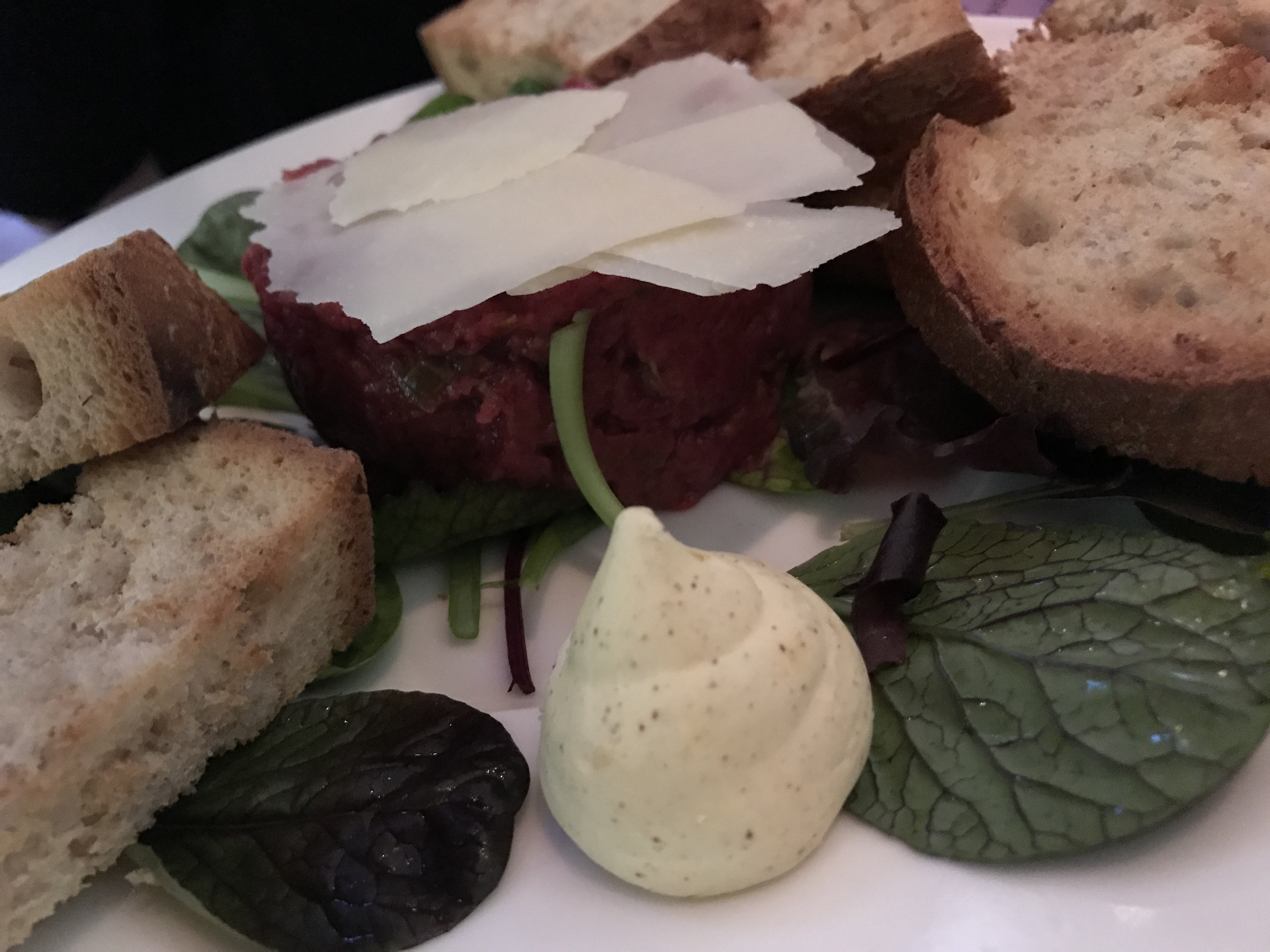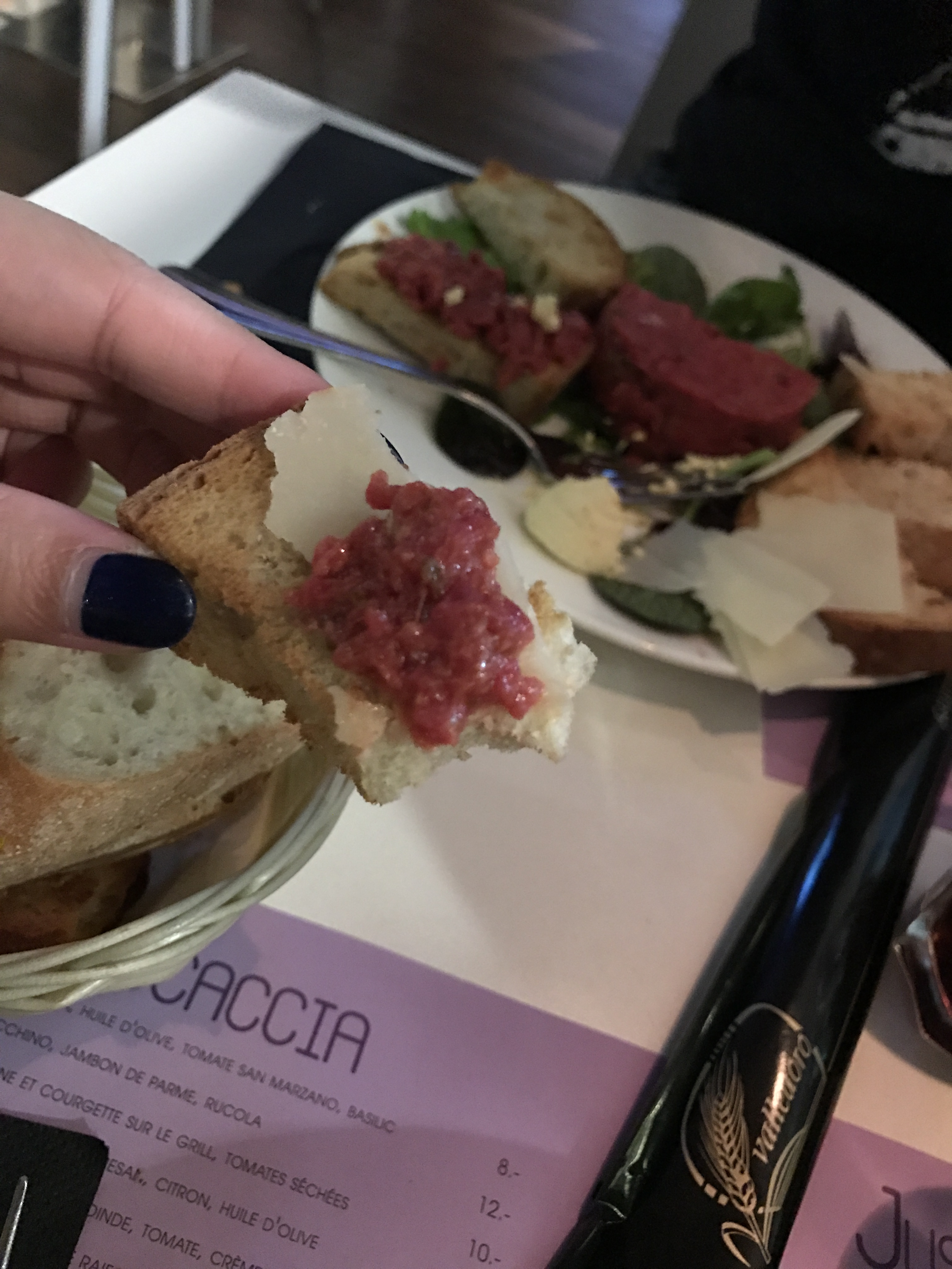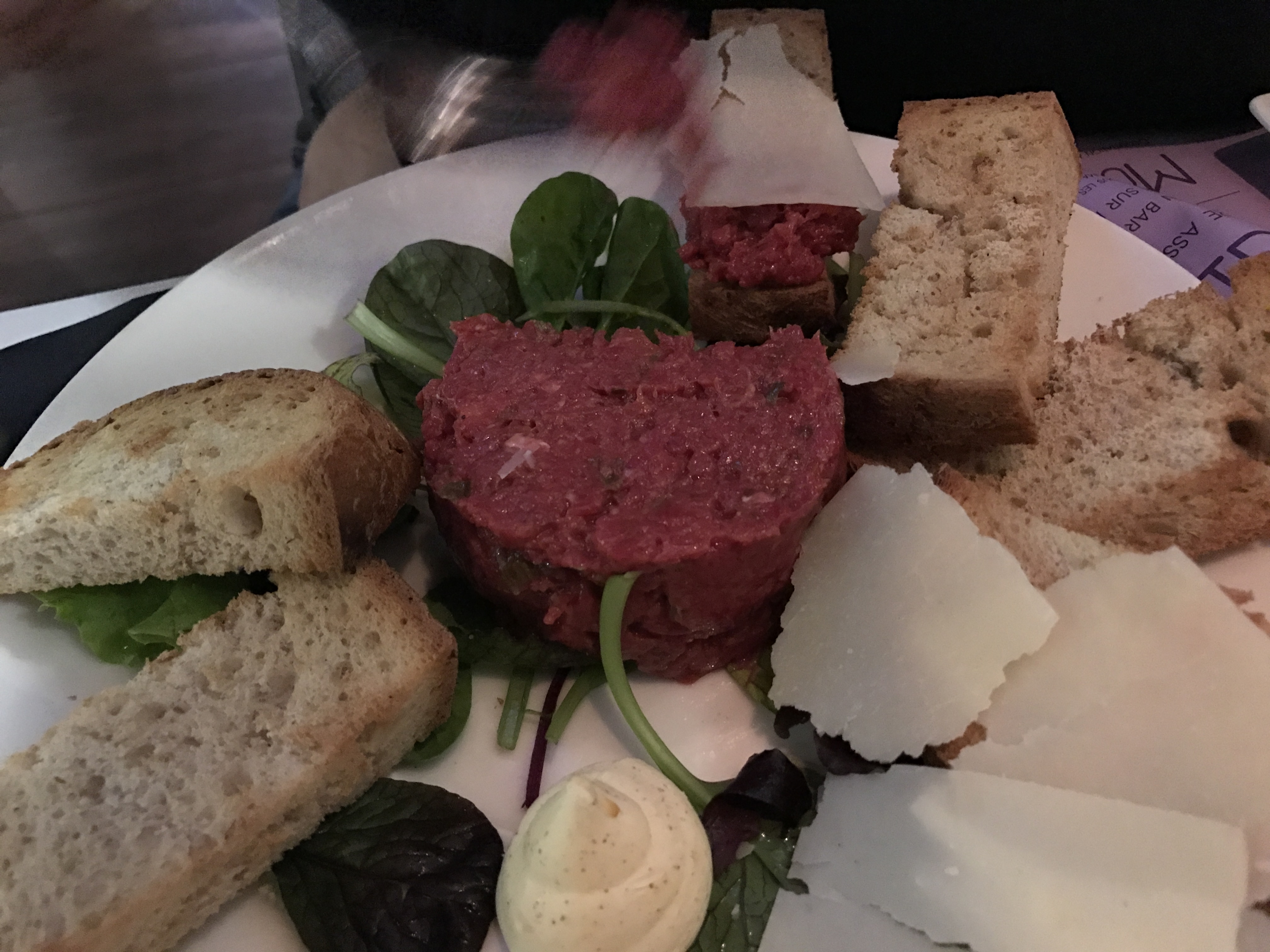 在这个广场上闲逛,然后看到了这家餐厅,于是就在这里食用晚餐了~ 餐厅不算小,有室内和室外的座位,10月的瑞士已经有点小冷了,于是坐在室内~ 是偶然进入的餐厅,没想到味道那么的好~ 点了一个生牛肉,非常好吃~ 看似碎肉的样子,放在面包上,配上芝士,口感很好,而且牛肉和芝士的搭配很完美~ 服务也不错,工作人员很NICE~