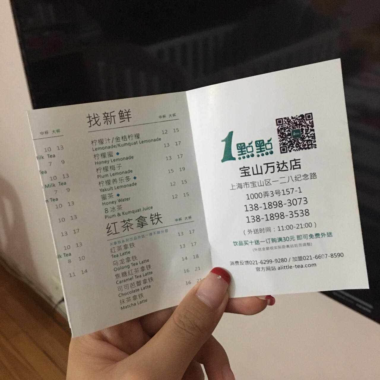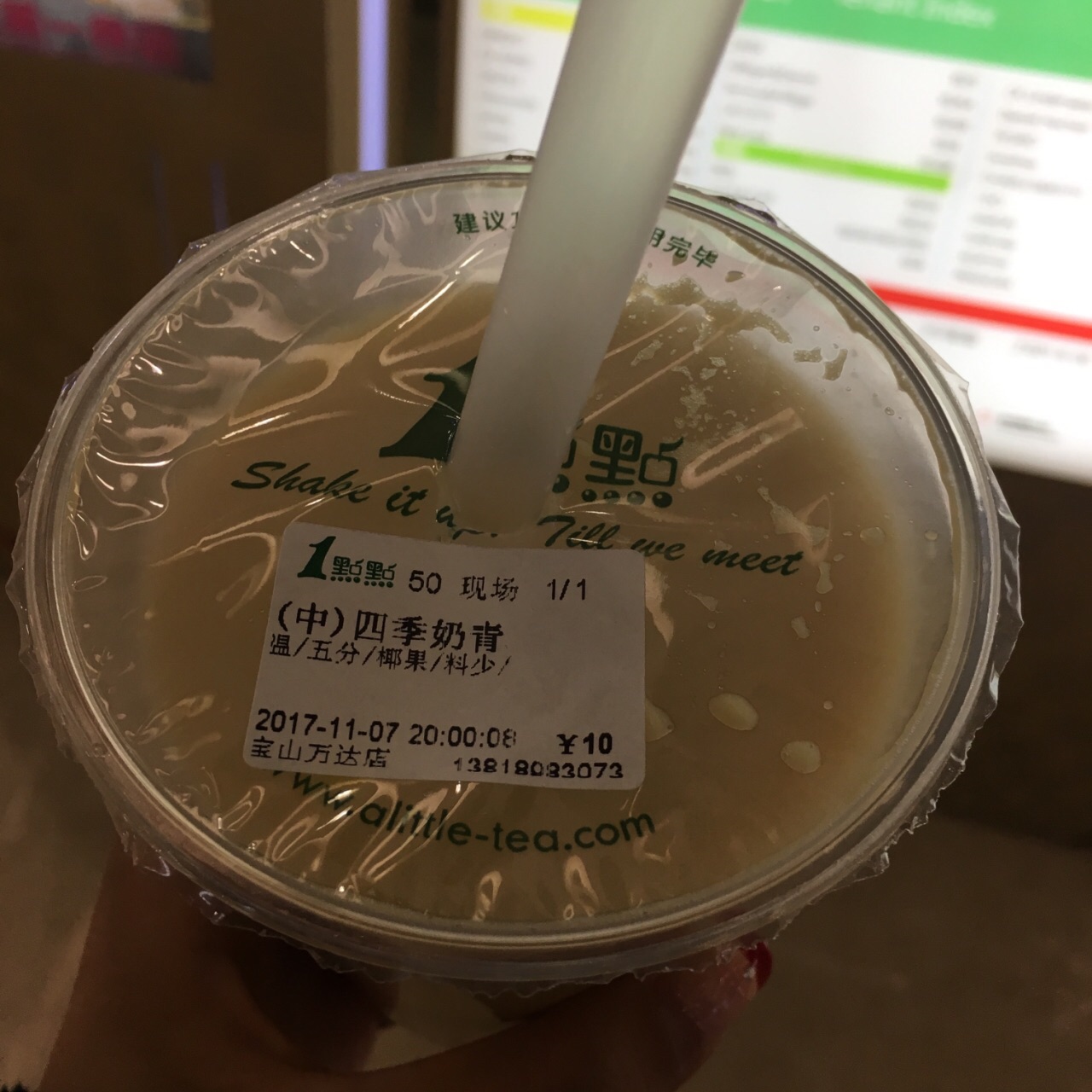 还是老样子,四季奶青+椰果,半糖就好。她家做的茶味挺重,超喜欢~~2017.11.07 晚上在边上3号楼做睫毛,搞定以后看到一点点还是忍不住买了一杯。还是老样子,四季奶青+椰果,半糖就好。她家做的茶味挺重,超喜欢~~