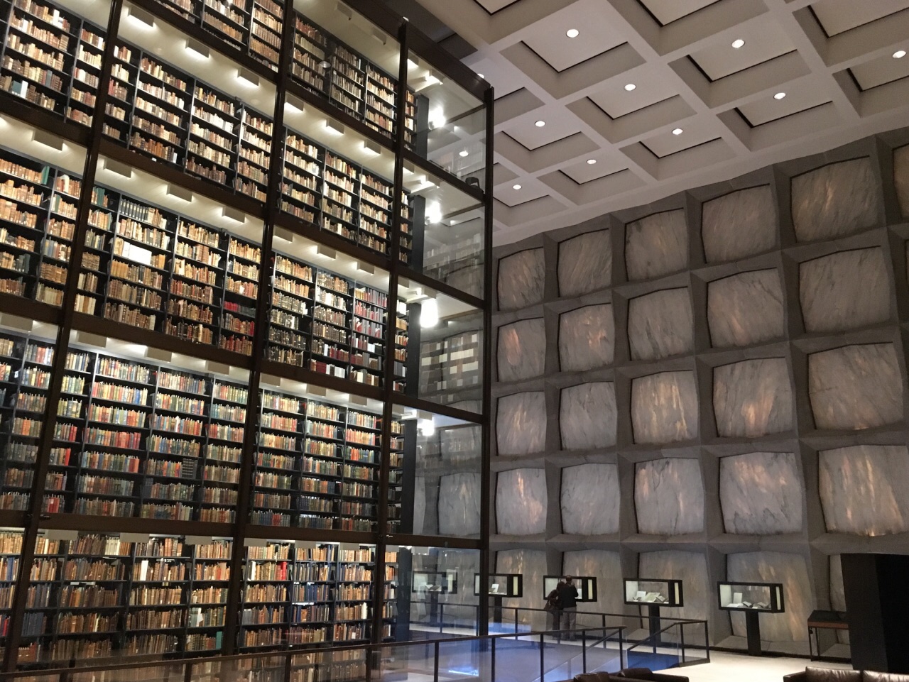 拜内克古籍善本图书馆六层的书库由玻璃立方体环绕,建筑上最大的创意是墙壁由两英尺见方的半透明大理石构成,使馆内微亮以防止阳光中的有害射线破坏图书。此馆建于1963年,由普利兹克奖建筑师戈登·邦沙夫特设计,是世界上最大的专为保存珍贵书籍和手稿的建筑。