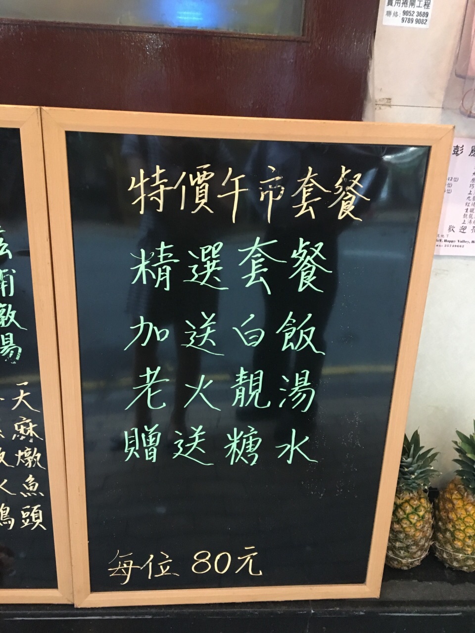 来到彭庆记纯属偶然,之前并没有做功略,路过店门口发现是家米其林,而且一看特价午市套餐80蚊/人,这不贵呀!于是就它了!套餐可选盐焗鸡、咸蛋肉饼、菠萝生炒骨、豉油皇蒸茄瓜...都配一碗老火例汤、丝苗白饭一碗。点了份盐焗鸡套餐,例汤先来,喝一口就相当的惊艳,的确有够水准;只是觉得这盐焗鸡应该叫做葱油鸡更贴切些,但不管叫什么,味道都很捧。若是份量再多点就更好了