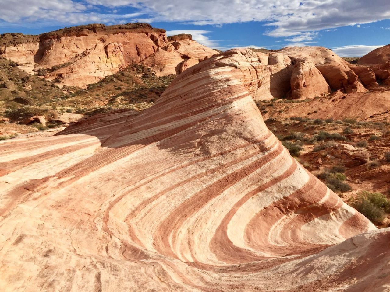网友2017-11-11那红白相间的岩石,非常奇特,值得推荐来游览到了拉斯维加斯了,除了人造繁华的赌城,不妨到离城50几英里的火焰谷州立公园看看自然景观,由于地壳变动,这么一层层的岩石,估计是一亿年以上从海洋地底变动而来的,因此又有天然博物馆之称。那红白相间的岩石,非常奇特,值得推荐来游览。