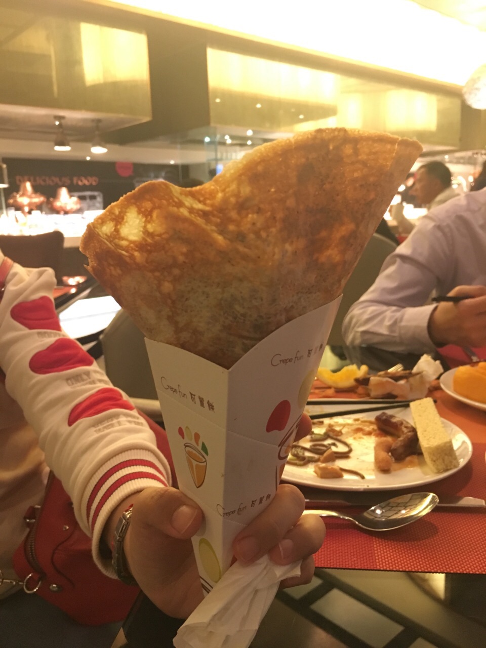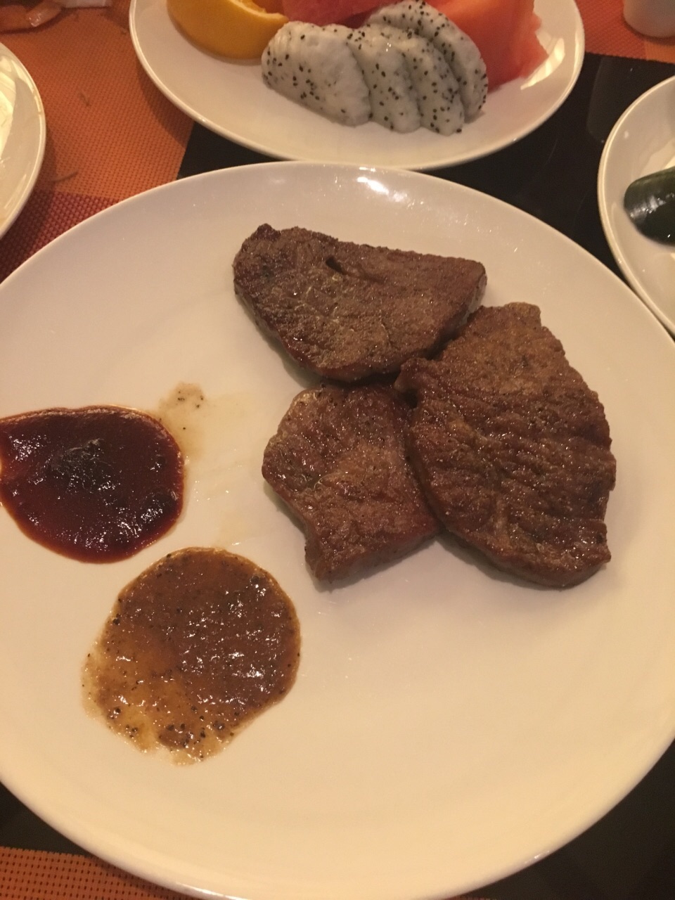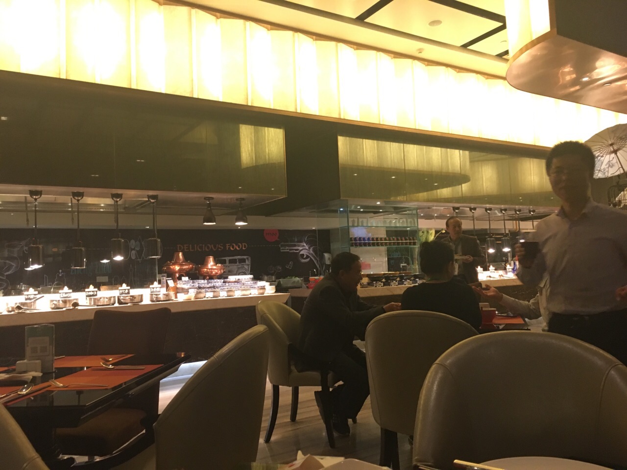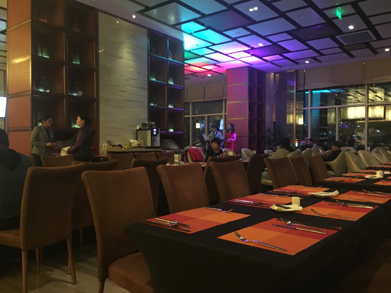 自助餐厅不是很大,晚餐我们取了牛排,很不错,肉质鲜嫩,不生不老,生蚝也还可以,没有羊排,没有鹅肝。三文鱼和其他海鲜一般,中式菜品还行吧,冰激凌还不错,西点不是很细腻,味道还可以。中式糕点还可以。早餐还不错,吃到了河南的糊辣汤。