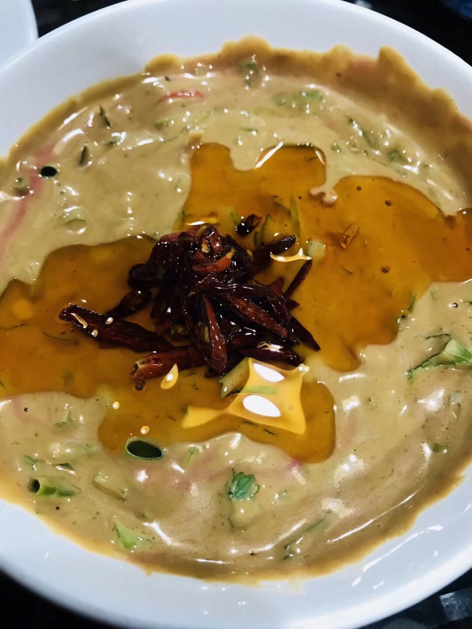 环境还挺好的,要的鸳鸯锅,感觉辣锅挺辣,要的肉和配菜比较多,最后都吃不完,炸馒头片配臭豆腐,怎么讲呢,个人还是接受不了这种口感...臭豆腐实在是吃不出它的美味。吃完油腻的火锅,来个凉拌西红柿挺好,手切羊肉不错,比较嫩。羊上脑和肥牛也还好,料儿调的不错,虽然有点咸