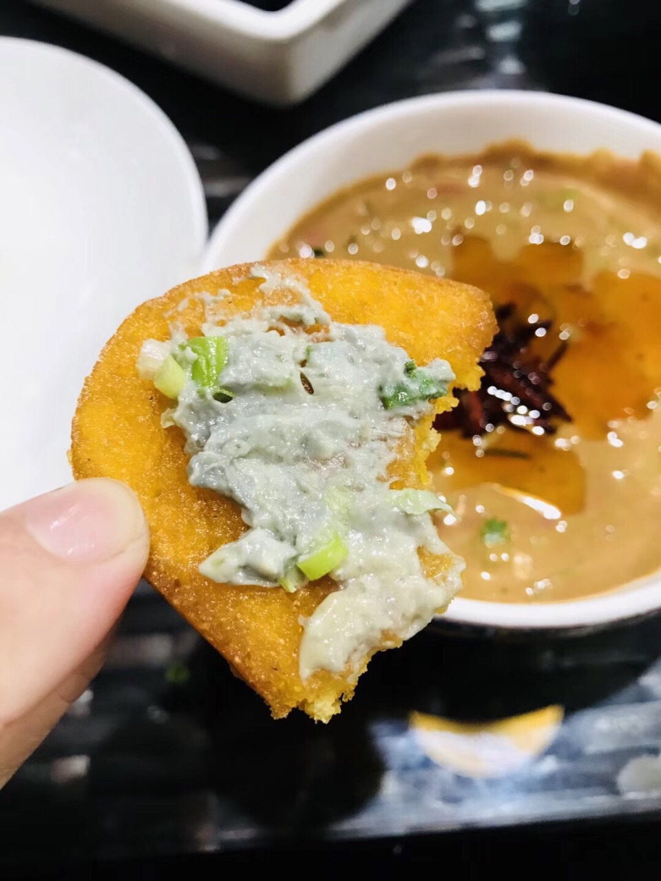 感觉辣锅挺辣,要的肉和配菜比较多,最后都吃不完,炸馒头片配臭豆腐,怎么讲呢,个人还是接受不了这种口感