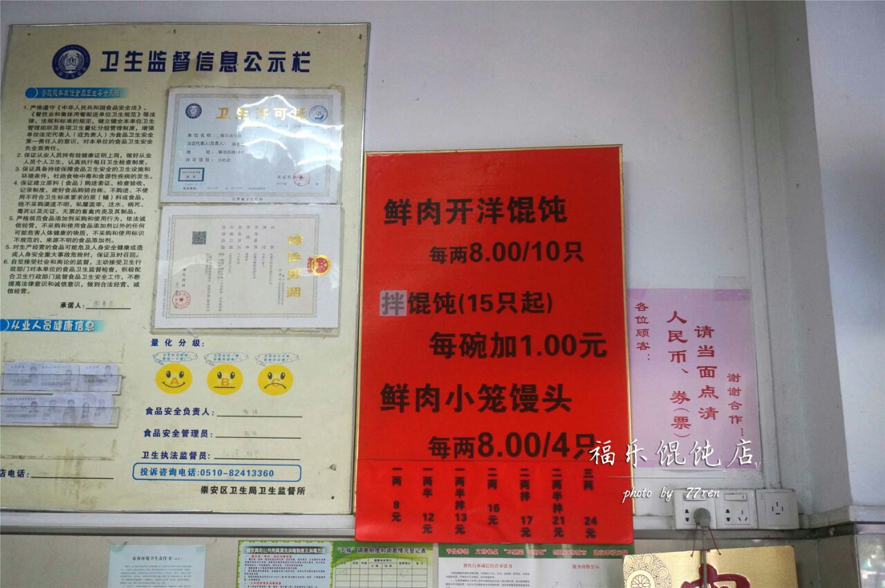 说起无锡的馄饨店,阿拉第一反应会是熙盛源,之前来对笑来喜印象也颇佳。 而这家福乐馄饨是真心没听说过,经过两天发觉其实无锡满大街的馄饨店...... 鲜肉开洋馄饨,标价是每两8米10只,拌馄饨是要15只起点的。 自从吃过笑来喜的拌馄饨阿拉就舍弃汤馄饨了,他们家的馄饨需要自己去后厨房取,有什么口味需求可以直接说,小伙伴稍微加了些辣酱。 然后可能酱料里面有油吧,酱油并不那么容易附着在馄饨皮上面。馄饨皮是我爱的那种厚且有韧性的口感,馅料里面的开洋吃得出咸腥味儿。 鲜肉小笼馒头,每两8米/4只,算是此次无锡行小笼里面最不甜的一家了,这样的甜度阿拉比较能接受,有些真是一口汤就像喝一口白砂糖浆一样......