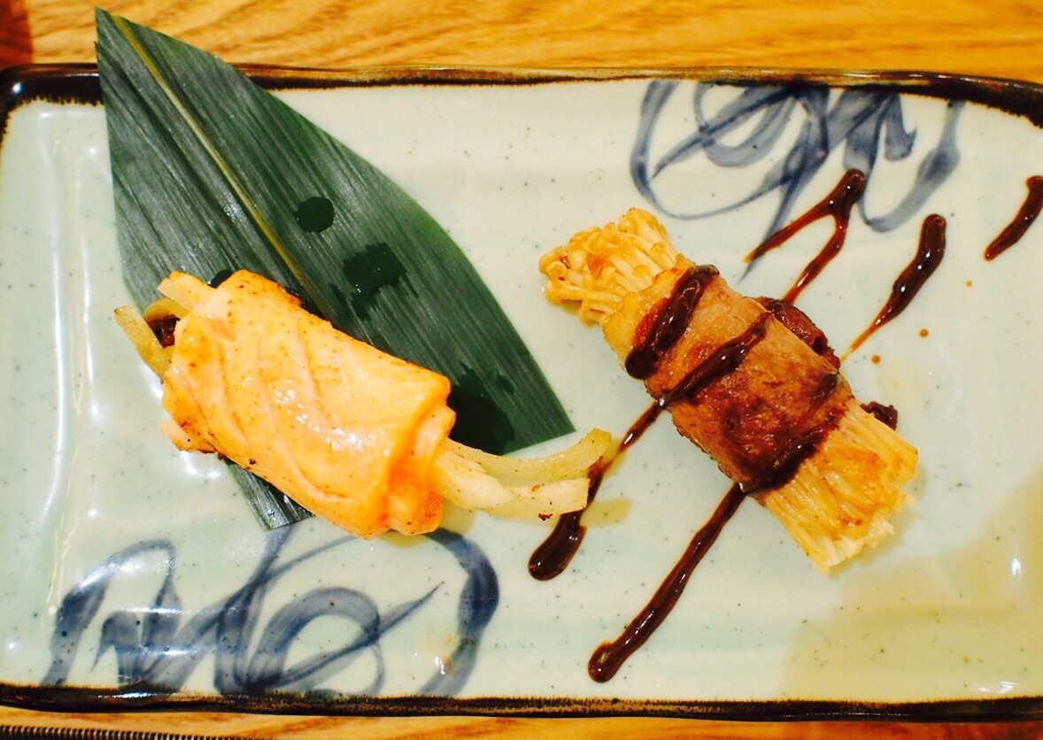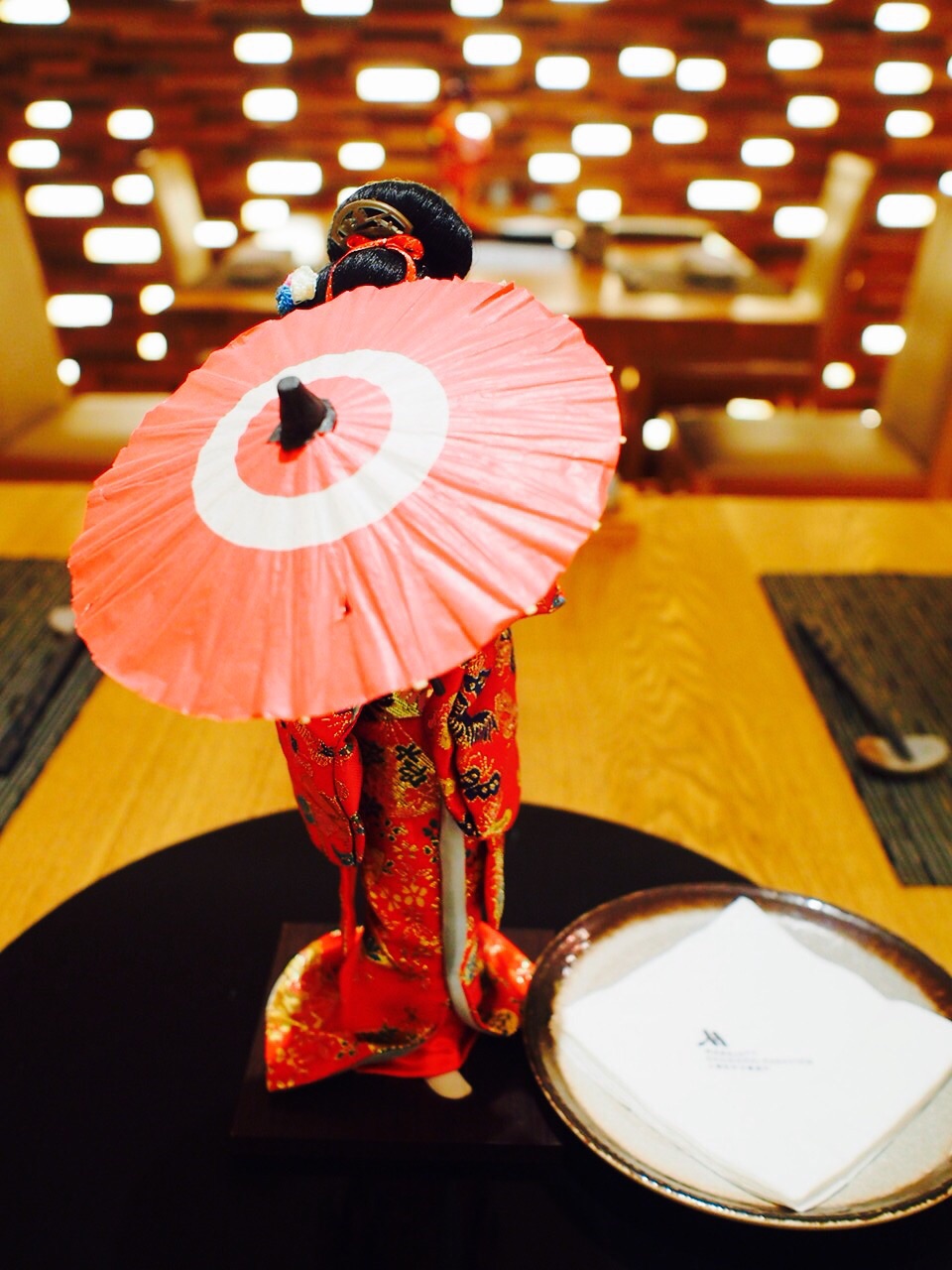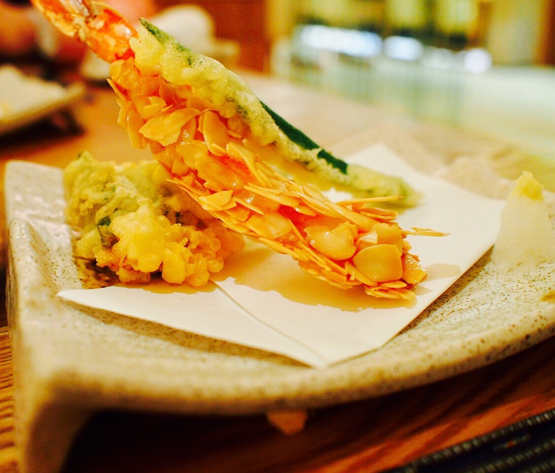 天妇罗配的明虾杏仁和大叶扇贝,拌过萝卜泥的酱汁蘸着吃,不会很油腻。主食是清汤荞麦面,前面因为会比较油一点,这就比较清淡了,过渡很好。最后是甜品,阴阳米糕,一白,一绿,糯米做的团子吃口很弹,没有甜味,是因为更好的衬托芝麻味的冰淇淋。还搭配了季节性水果哈密瓜和西瓜若干。