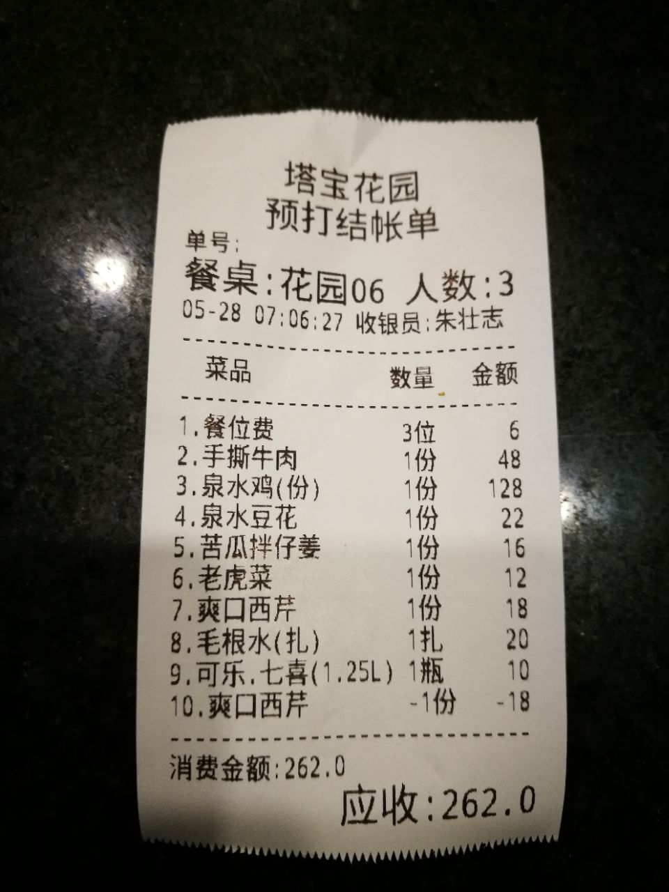 来重庆旅游。选个天气晴朗的下午去南山泉水鸡一条街,品尝泉水鸡,餐后,步行20分钟,到一棵树观景台欣赏重庆夜景,是游览重庆很好的一个选项。 看点评推荐,塔宝花园,我和家人打的上山,慕名而来。 塔宝花园在上山公路右手边,有很大、很醒目的招牌。饭店庭院布局,有餐厅,花园,住宿,是一家星级装修标准的度假酒店。 餐厅在室内区域和室外区域,室外区域,餐桌散布在花园之中,环境优雅,田园风光。 泉水鸡,菜名的直觉应该是清淡鲜嫩,端上来一看,是麻辣味。夹一块入口,前味是温和的麻辣感,鸡块入味很深,口感细嫩,吞咽时,后味鲜香。他家泉水鸡作为招牌的特色菜肴,本人评价口味五颗星,价格小贵,整体四颗星。 泉水豆花,口感很细腻,清香,正好中和泉水鸡的麻辣刺激。 因为环境优美,天气又好,和家人在一起,就餐氛围非常惬意。一次愉快的旅行。