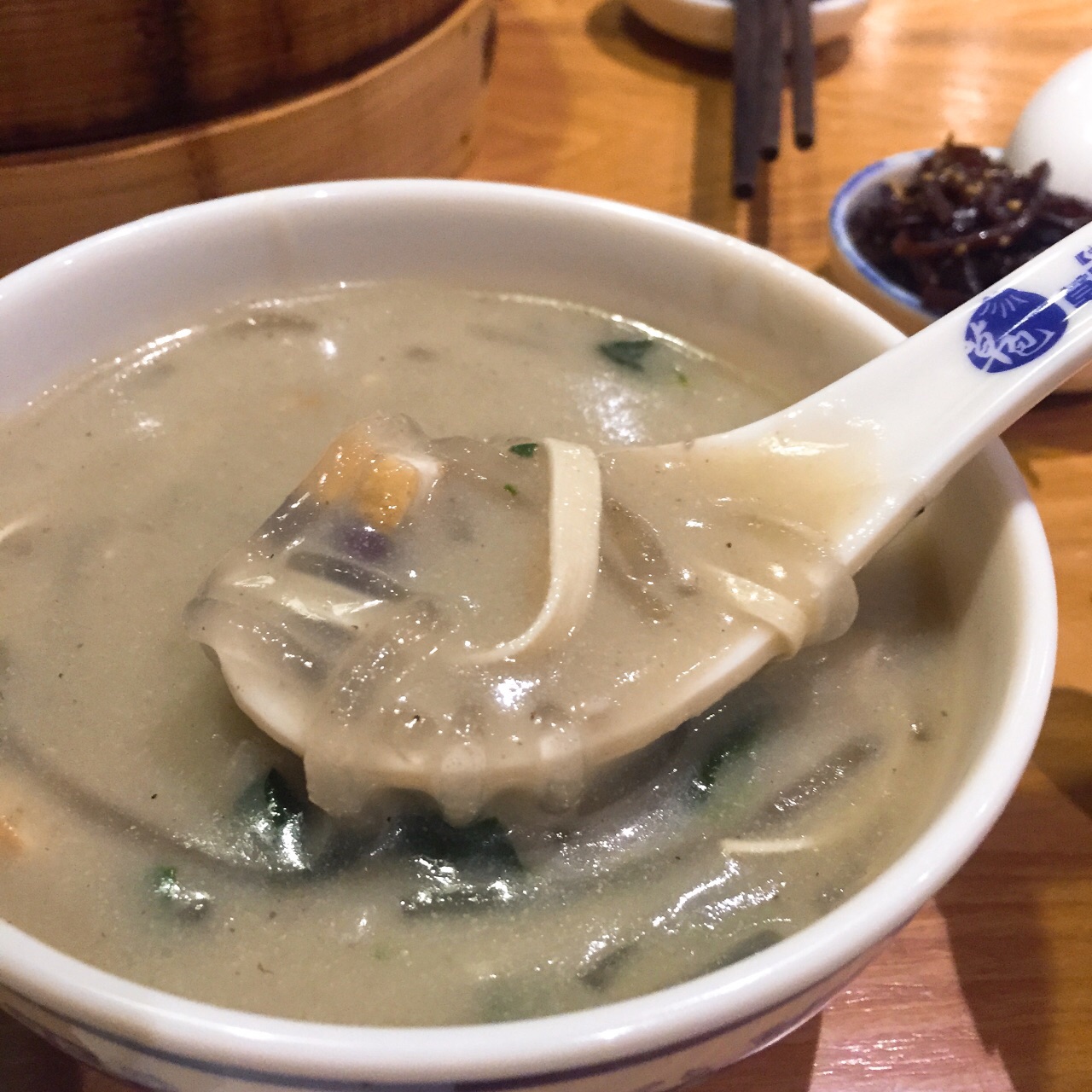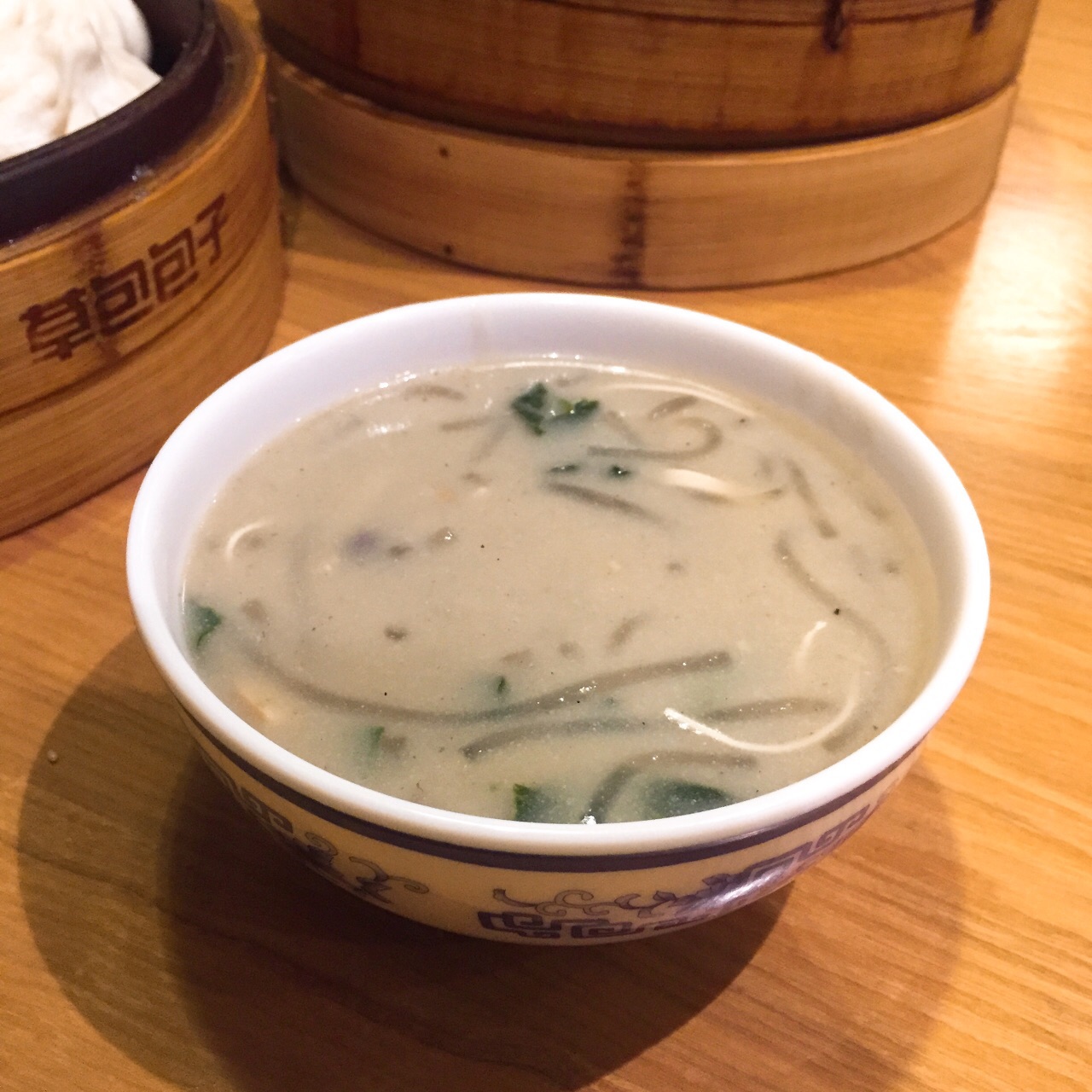 ✨吃在宽厚里✨ 吃午饭最尴尬的时间点是下午3-4点,还好草包开着,从外卖窗户被招呼进了店里,毕竟,室外温度已经到了冒热气的包子没走几步就会凉的阶段。 一笼虾仁鸡肉包,半笼胡萝卜包,再加一碗甜沫,简单吃吃是够了。环境比普利街老店提升了不少,微信点餐方便快捷,服务也可以。 包子不算很热,可以拿来直接入口,胡萝卜馅儿太干,包子一拿,底儿就粘破了,虾仁鸡肉相对还好,甜沫就不太喜欢了,胡椒面的味道太浓厚,没喝几口。 曾经的草包不复存在,把它当做一家普通的包子铺来吃可能会好一点。
