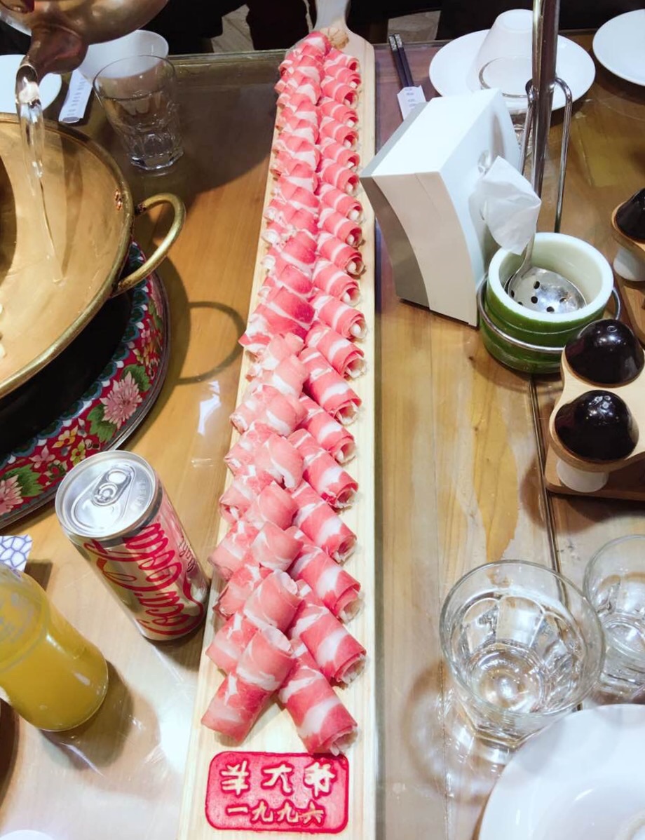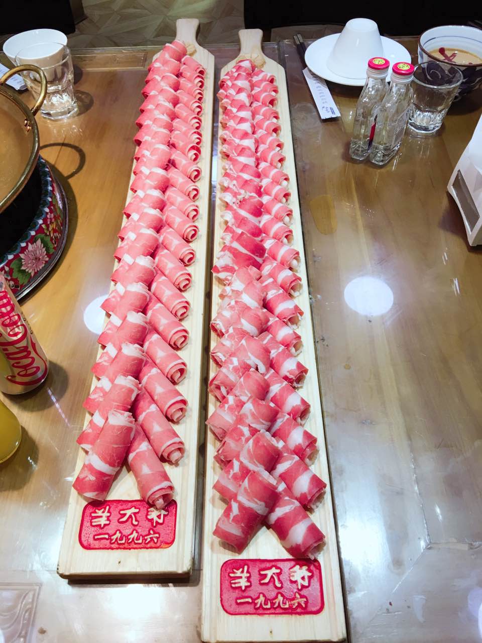 羊大爷曾经上过各种热搜,也算是火锅界的网红店,作为一个纯正的肉食动物,当然点了不少肉,鲜羊肉、肥羊、羊肚、羊脑全上了,这里所谓的1米板羊肉,就是将羊肉切片放在一块一米的板子上,非常好看很有特色,麻酱味道不错,上面还别出心裁地做了个“羊”的字样,感觉像是花生酱、腐乳酱加上麻椒和芝麻酱共同熬制而成