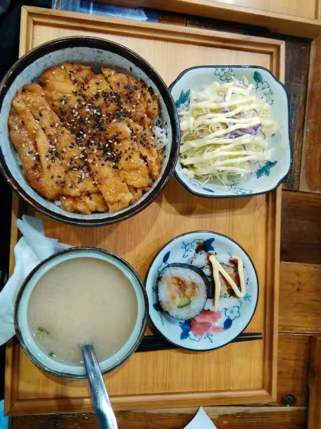 很适合一个人来吃,一贯的日式小店,位置狭小局限,永远都是人满为患的排队长龙和座位。所以我每次都是独来独往,可以减少排队的机率,也可以偶尔被派坐到吧台,看着厨师做菜,感觉很有意思。 白开水可以自打自取,服务员态度非常好,基本上有求必应,而且都很迅速,更不会因为你团的餐而令眼相待。 每次都点照烧鸡排饭,因为很好吃也很经典,套餐包括味增汤、寿司、沙拉。首先鸡排真的超级好吃,外焦里嫩,一点不腻,汁也比较多,很下饭,口感偏甜。味增汤,料很足,海带、豆腐还有萝卜都很多,喝了两碗,感觉很美好。寿司也挺好吃的,沙拉,米饭和汤都可以自助添加的,真有食堂的范儿哦!