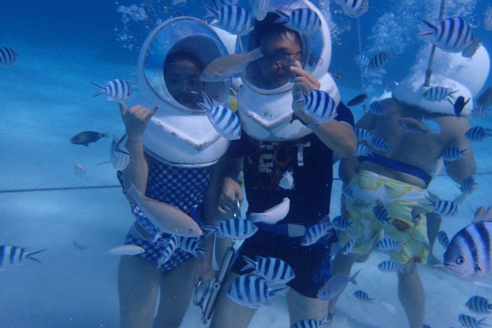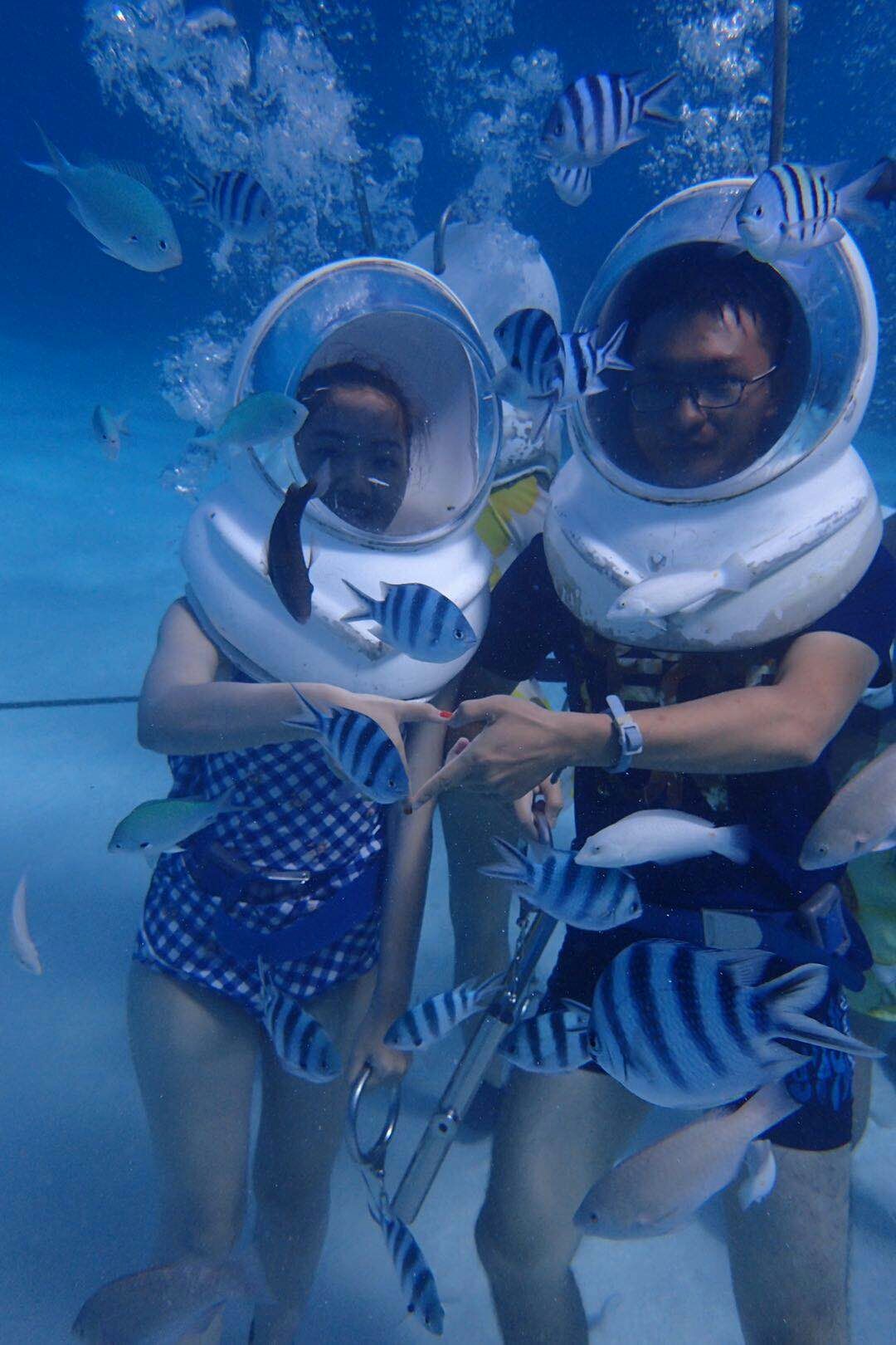 就是氧气头盔很重还有导游给我们香肠喂鱼被鱼咬了哈哈哈但是挺好玩的。没有想象中那么难没有想象中那么难。下水前很害怕但是下去感觉很放松了。就是在水下拍照没有走几步。就是氧气头盔很重还有导游给我们香肠喂鱼被鱼咬了哈哈哈但是挺好玩的