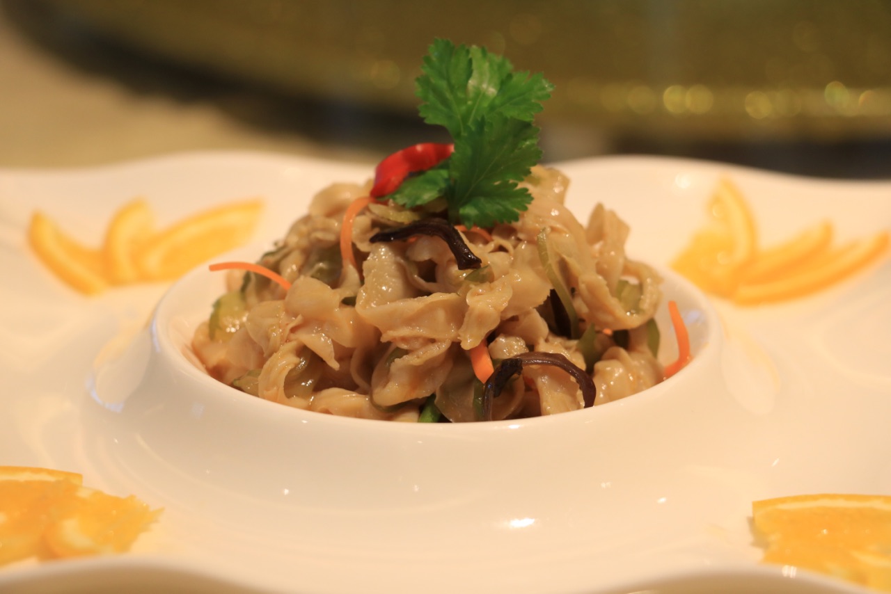 酒店的四楼——海中天,午餐有着自助茶点、粤菜可以选择,也可以单点茶点和粤菜拼合。中式的餐厅,中式而复古的装修环境,一如所有酒店一样的格局,环境不算大,有着圆桌、方桌。 人多选择了粤菜加茶点,还好早早定了位置,是间入门的大包厢,一行十人坐下来恰好。还有着泡茶区,包厢环境雅致、舒适。坐下服务人员就送上茶水。 精致的凉菜四小碟,凉拌木耳、萝卜皮、鱼皮、裙边,每一道都非常精致,尤其是萝卜皮还摆出了个花。清爽而开胃的前菜确实不错。 烧腊拼盘,不得不说非常喜欢,尤其是烧肉,皮脆香而肉嫩,口感超级棒。鼓油鸡、叉烧味道也非常正,那嫩嫩的口感,着实讨喜,再配上一口海蜇清爽而怡口 老火靓汤是每天不同的,今天是木瓜炖排骨,这个燥热的季节恰好,喝上一碗滋补一下。慢火炖的汤,香浓而不腻,带着木瓜的淡淡甜味,入口更多了份惊喜。 酱串烤虾非常特别,不用剥壳的虾本就非常讨喜,口感上不是平时吃的鲜嫩,而有非常有嚼劲的,越嚼越香,让唇齿都留下虾鲜之味。上面的酱则加了萝卜干和蛋,用来配饭非常适合呢,也是非常鲜香之味。 薯格牛肋骨,份量很大呢,而且那牛肉软而不柴,入口的中带着酱香之味,不论老人和孩子也都可以食用,这样的牛排也是一份惊喜。 喜欢的招牌手工豆腐,带着蛋的清香,还有海苔的味,入口是外酥里嫩,搭配的小蘑菇也特别的鲜美。 厦门的特色菜海蛎炸,就是吃的新鲜、香酥,配料和口感都非常棒,转一圈就空盘了。 最后一道上汤时蔬更是非常讨喜,清爽而鲜嫩的味道就是那么的爱。 搭配的茶点有榴莲酥、虾饺、春卷条、葱油饼,都非常不错,如果中午来此吃份自助茶点也特别的棒,而且价格实惠98一人。 美的美的餐食完,甜品是手工红豆沙,最爱的美味不过红豆,这一份手工制作的红豆沙更是让这次的午餐满足感更加一筹。
