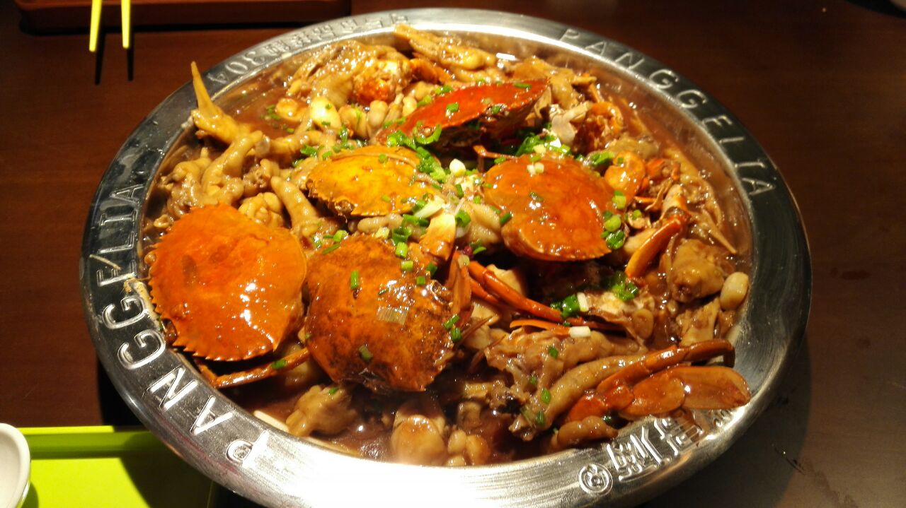看着就很好吃的样子,酱料是这一锅的关键,香香的,麻麻的(我们免辣)让人有吃了再想吃的感觉,重口...蟹煲加牛蛙,满满一大锅,看着就很好吃的样子,酱料是这一锅的关键,香香的,麻麻的(我们免辣),让人有吃了再想吃的感觉,重口味的吸引力啊。