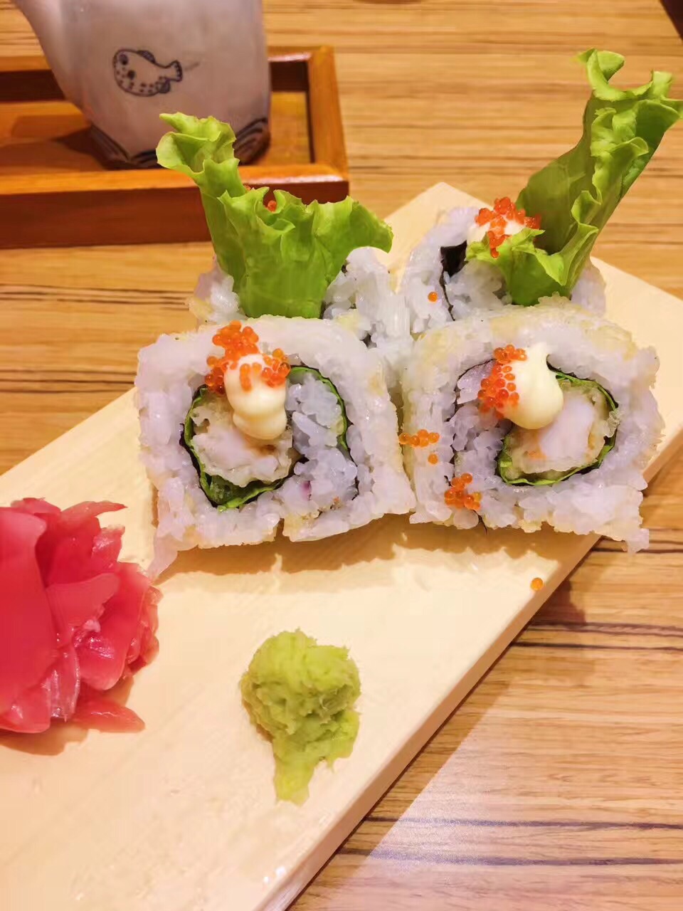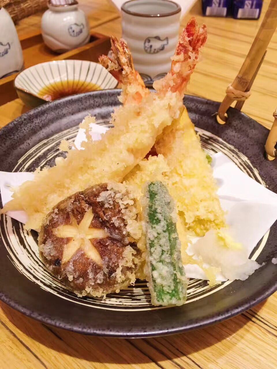 这里koko,据说是哈尔滨吃河豚的唯一安全放心的好去处。薄薄的一片,卷上萝卜泥,葱花粘特质的蘸料,很鲜美。牛肉火锅,汤鲜肉嫩,蘸着鸡蛋吃,味道更鲜甜。大虾寿司,里面有脆脆的炸虾,一口一个,很过瘾。天妇罗和炸鸡不是很满意,有待提高。