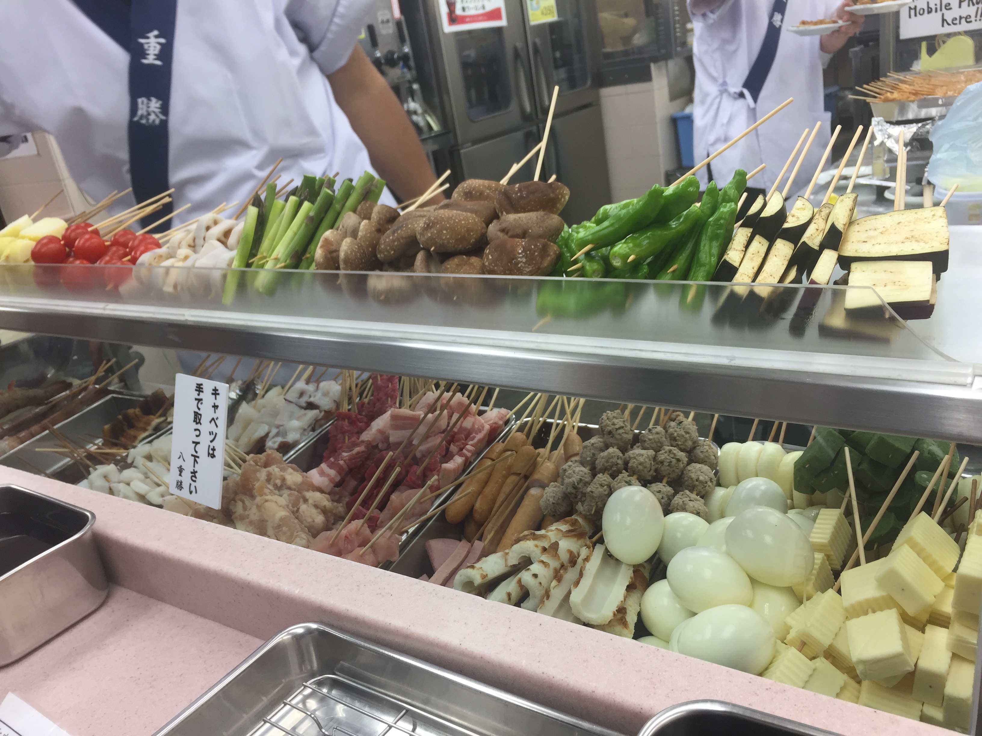 天王寺附近著名的炸物店,据说开了有30多年,上过很多电视美食节目。在当地保持着很高的人气。店内明档操作专门以油炸各种各样的天妇罗为特色。 食客都是围坐在吧台,选择自己喜欢的食材,点好后厨房小哥直接拿去裹粉上酱,然后直接烹炸,一气呵成,动作很快!牛筋味噌烧、炸鸡肉串、炸鲜贝柱及炸各类蔬菜都是这里点单非常高的菜。 特别注意的是店内商家会提供一大份沾酱,刚炸好的天妇罗可以直接放酱料内滚酱,但千万不要重复蘸哦。炸物吃多了感到油腻的话,可以选择吧台上任吃的圆白菜叶,可起到解腻作用!另外建议点上一杯这里的生啤,天妇罗炸物和生啤绝对是最佳拍档!