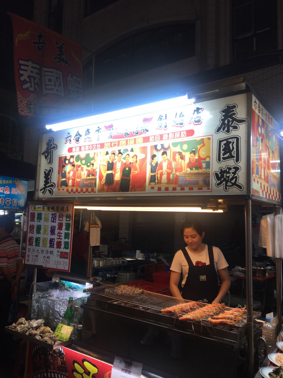 看奇美泰国虾的招牌上写的每一串小虾是150台币,大虾是250台币。但是再一看正在烤的虾,有的一串是十只虾,而有的一串上又有四只虾,所以搞不清楚这一串的概念到底是什么。最好是要吃之前问清楚老板,不要到时候又有纠纷产生。虾一定都是相当新鲜的,都是现抓现烤。