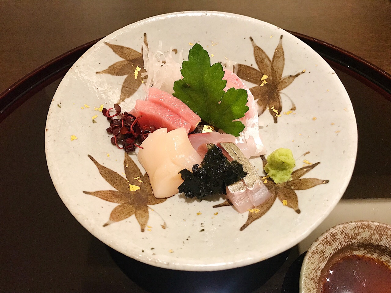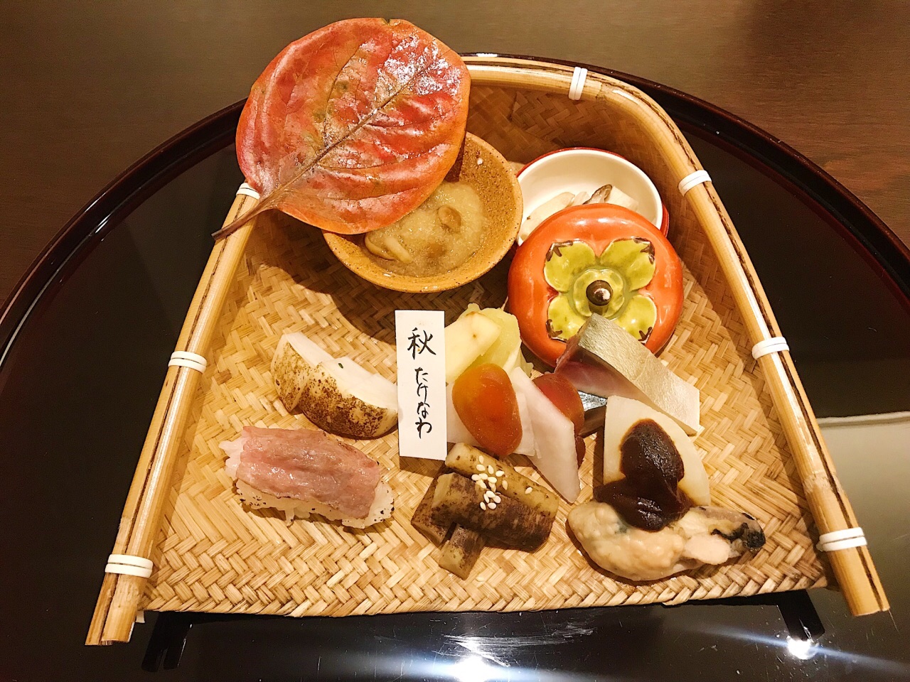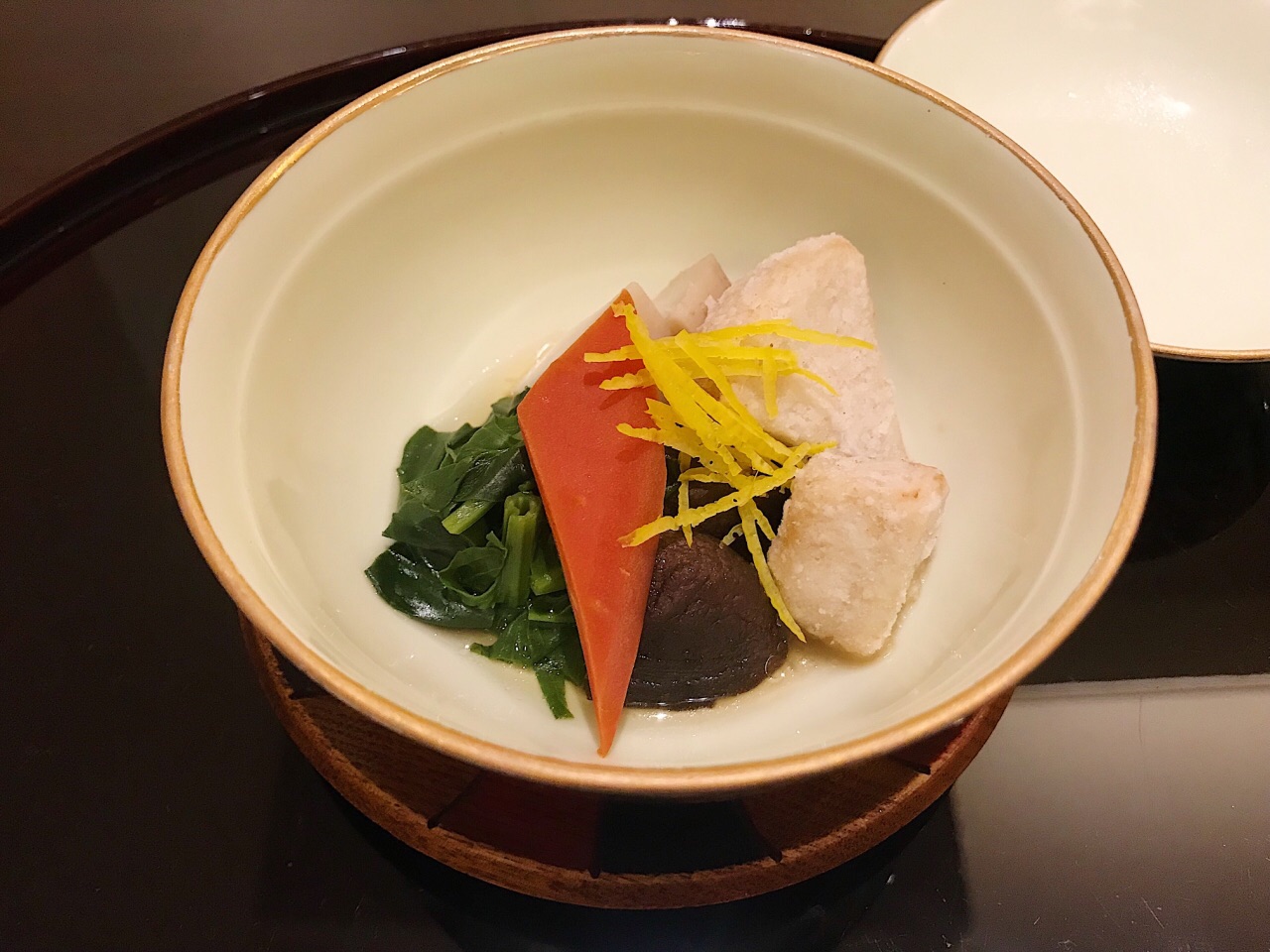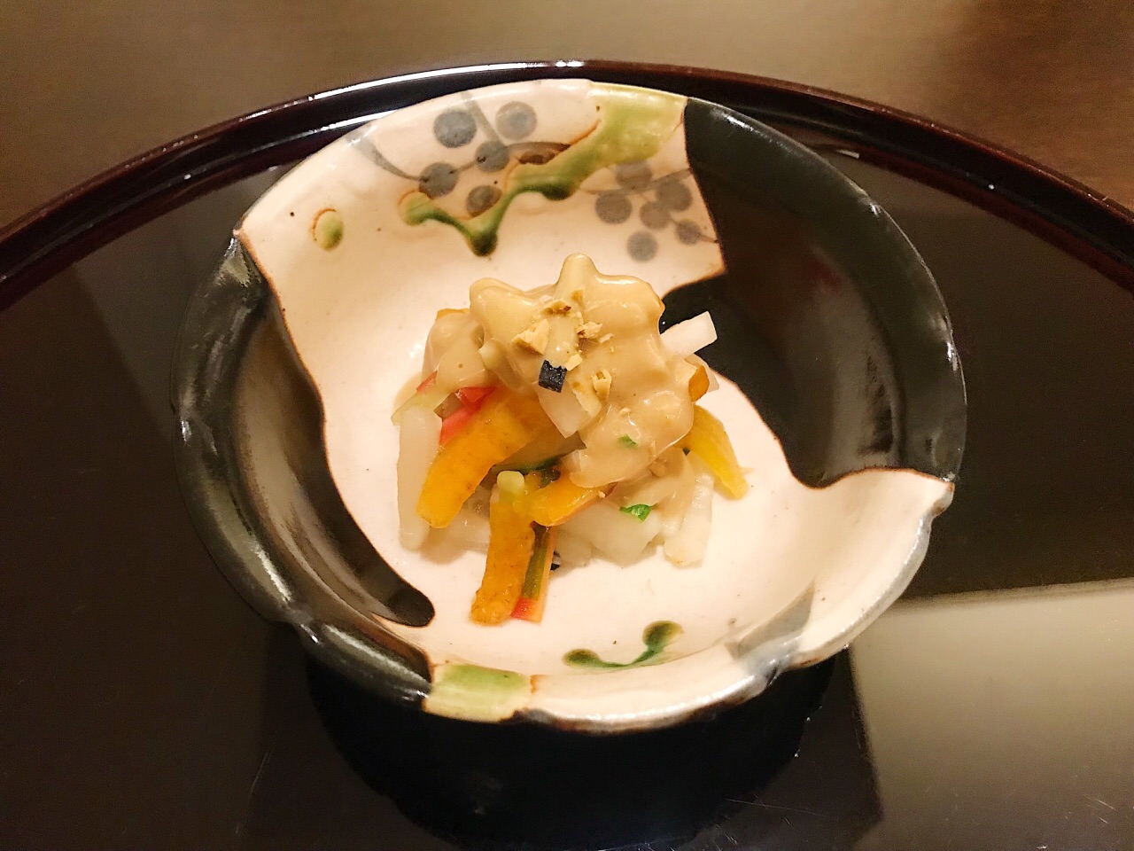 懐石料理 三木 也许是曾经在老牌料亭吉兆的东京酒店里的分店修业过,三木师傅的出品能感受到明显的京都茶怀石特点,有板有眼的以一碗抹茶配羊羹来做结尾。同时,多样食材的使用与叠加,也清晰的将自己吉兆系的胸牌亮了出来。 开场的醋拌柿子萝卜丝,还加入了混了碎花生的芝麻酱,醇厚的干果类油香融合进清爽突出的淡淡醋酸,层次分明,刚柔相济。 在神户这样对于性价比和创新性有较高要求的城市,能呈现这样一套传统排场的料理,意义非凡。