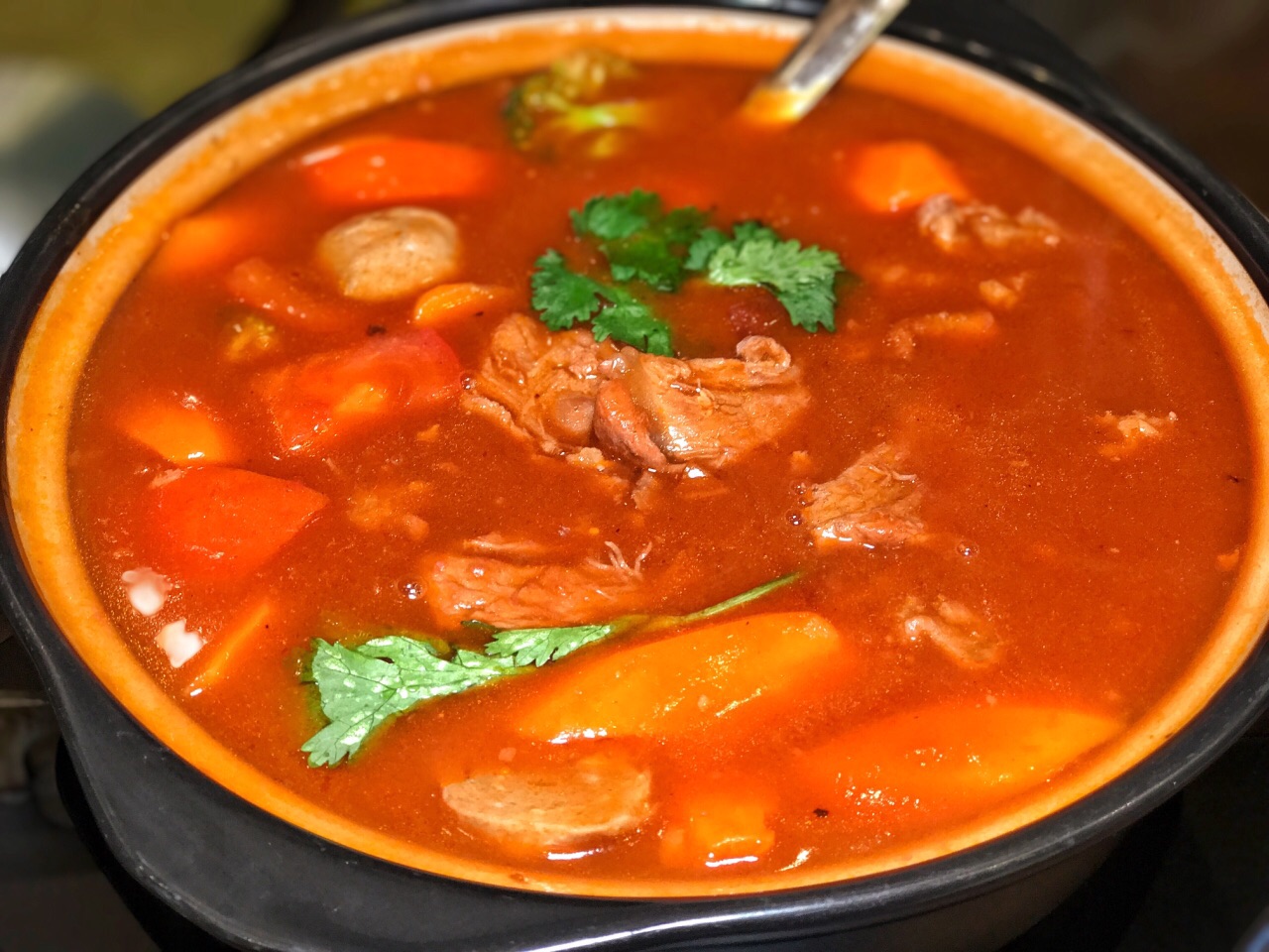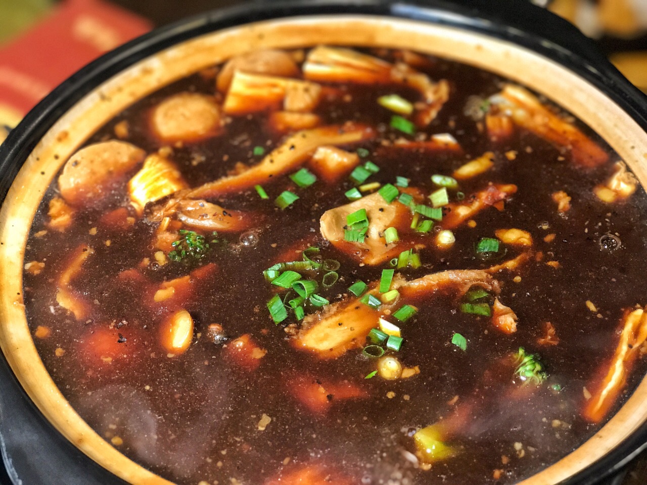 黑椒牛杂锅,浓郁的黑椒汁与牛杂特别搭,吃完牛杂用汤汁捞饭特别赞。烤牛肉串、牛肉春卷也值得推荐