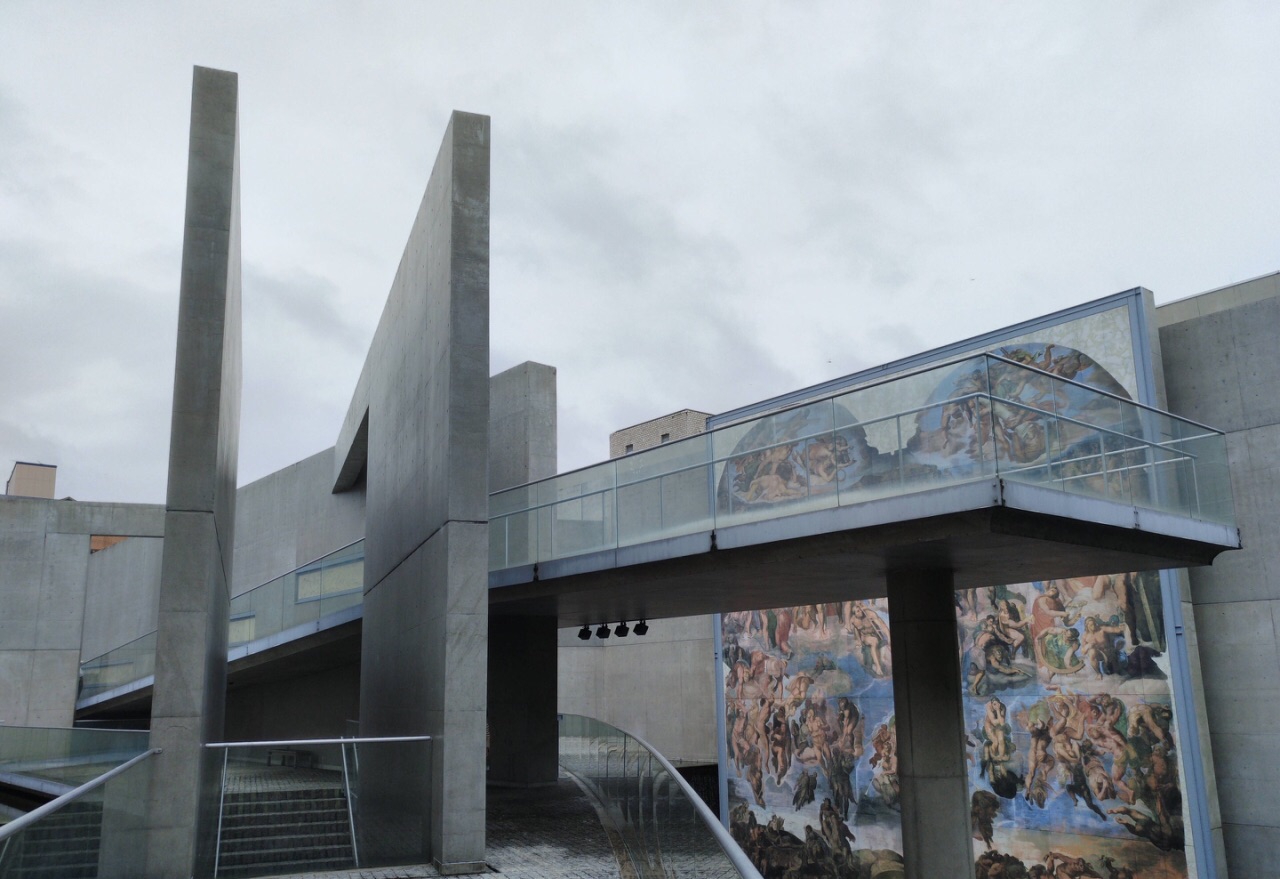 陶板名画庭 安藤忠雄1994年作品 “是世界上第一个以回廊式绘画庭园方式,忠实地再现名画的造形和色彩的陶板画庭园。这与传统的庭园从根本上有所不同,传统庭园平面构成多,而安藤忠雄强调的不是静,而是动线的重叠,错综立体的视线很深地深入地下的效果。” 最后一幅《最后的审判》高13米宽12米