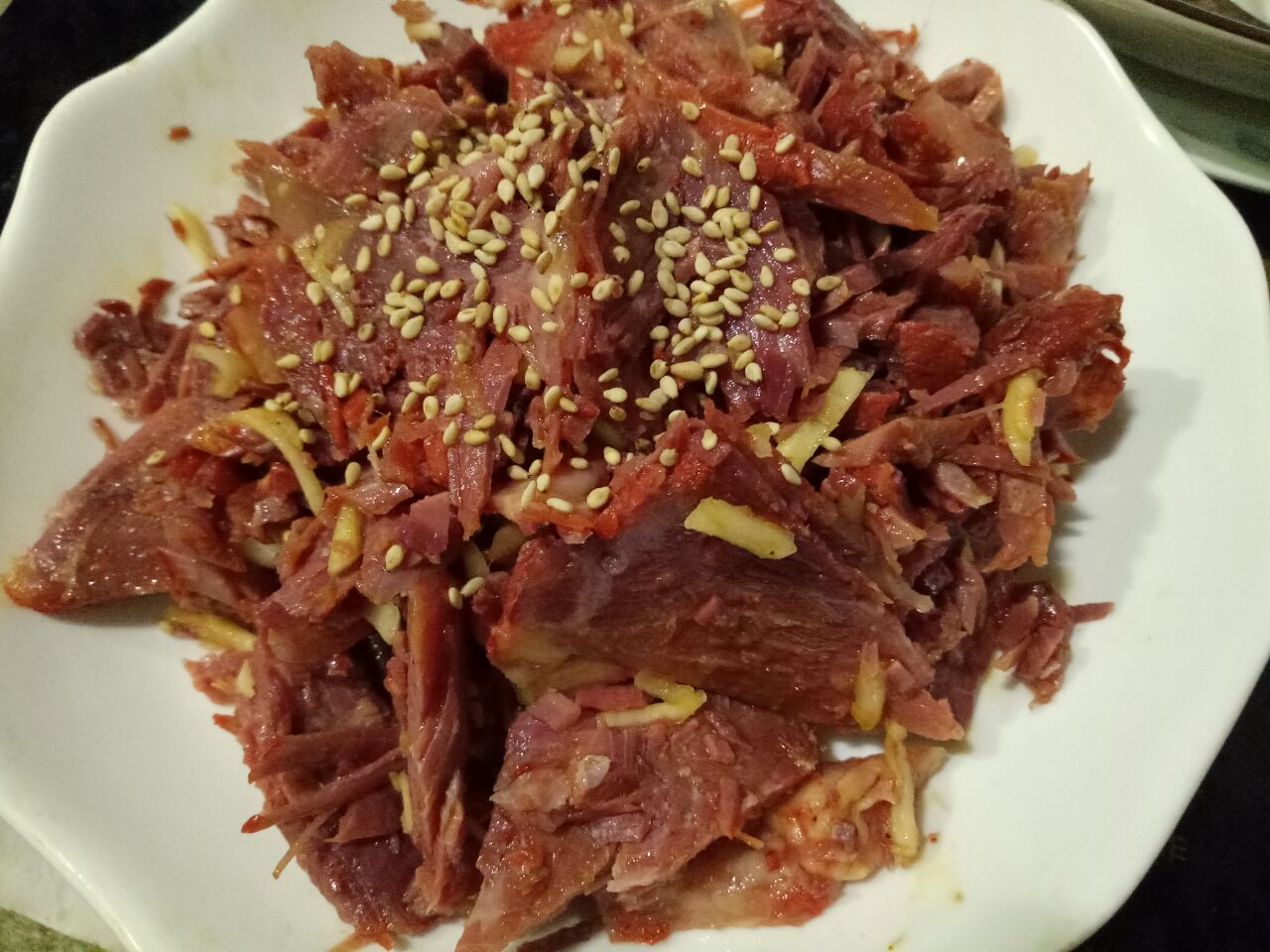 腊牛肉回家干切成薄片,放点辣油,蒜末,香醋,麻油,凉拌吃也很赞~下午去时人不是太多,排队时间不长