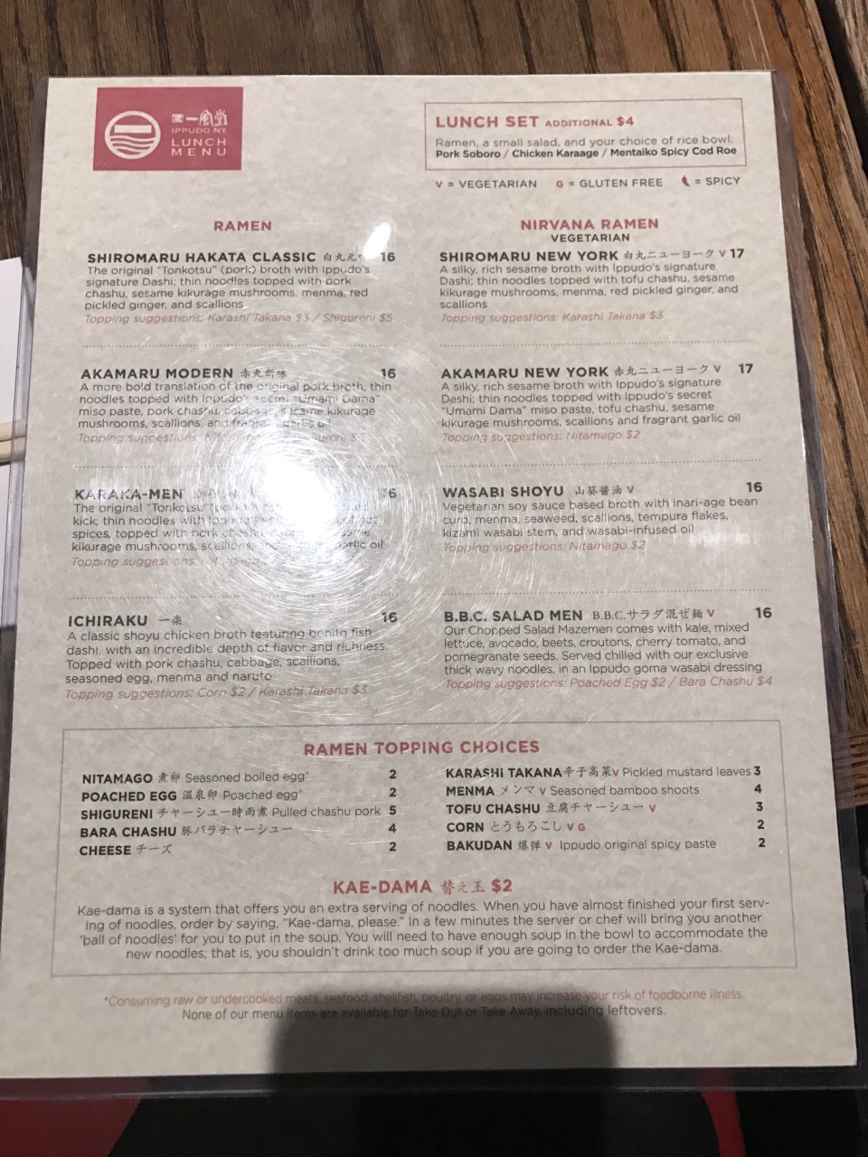 想吃面网上查信息一风堂比较好吃就慕名而来,据说排队,所以决定晚点到中午1点后到达,入座率仍在90[%]以上,服务员推荐的经典白丸,赤丸面,加额外2美金一个,面口味一般,喜欢肉夹馍:肉夹馍鸡肉的比猪肉的好吃。 小黄瓜凉菜还可以。面17美金左右一碗,餐饭加小费120美金。