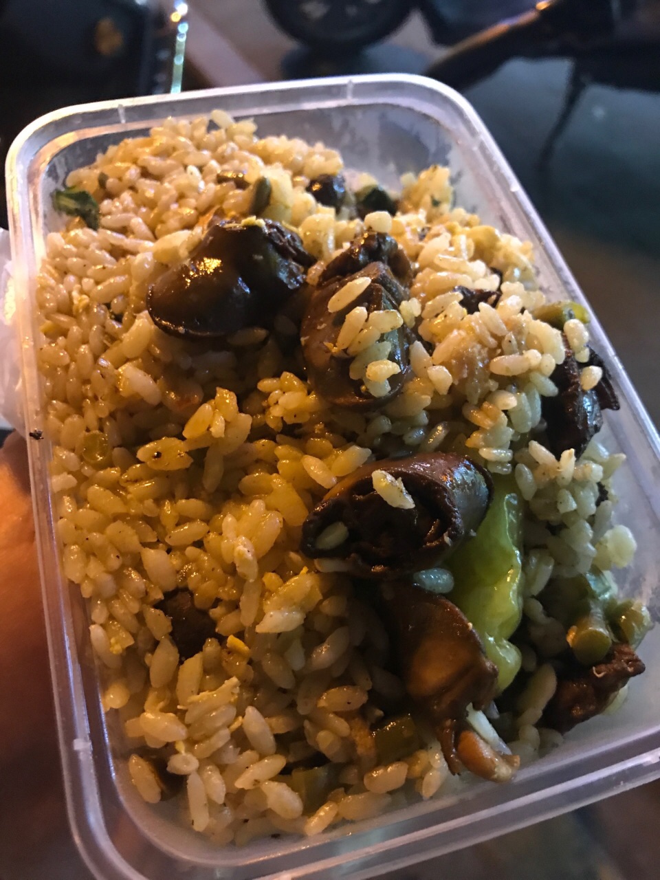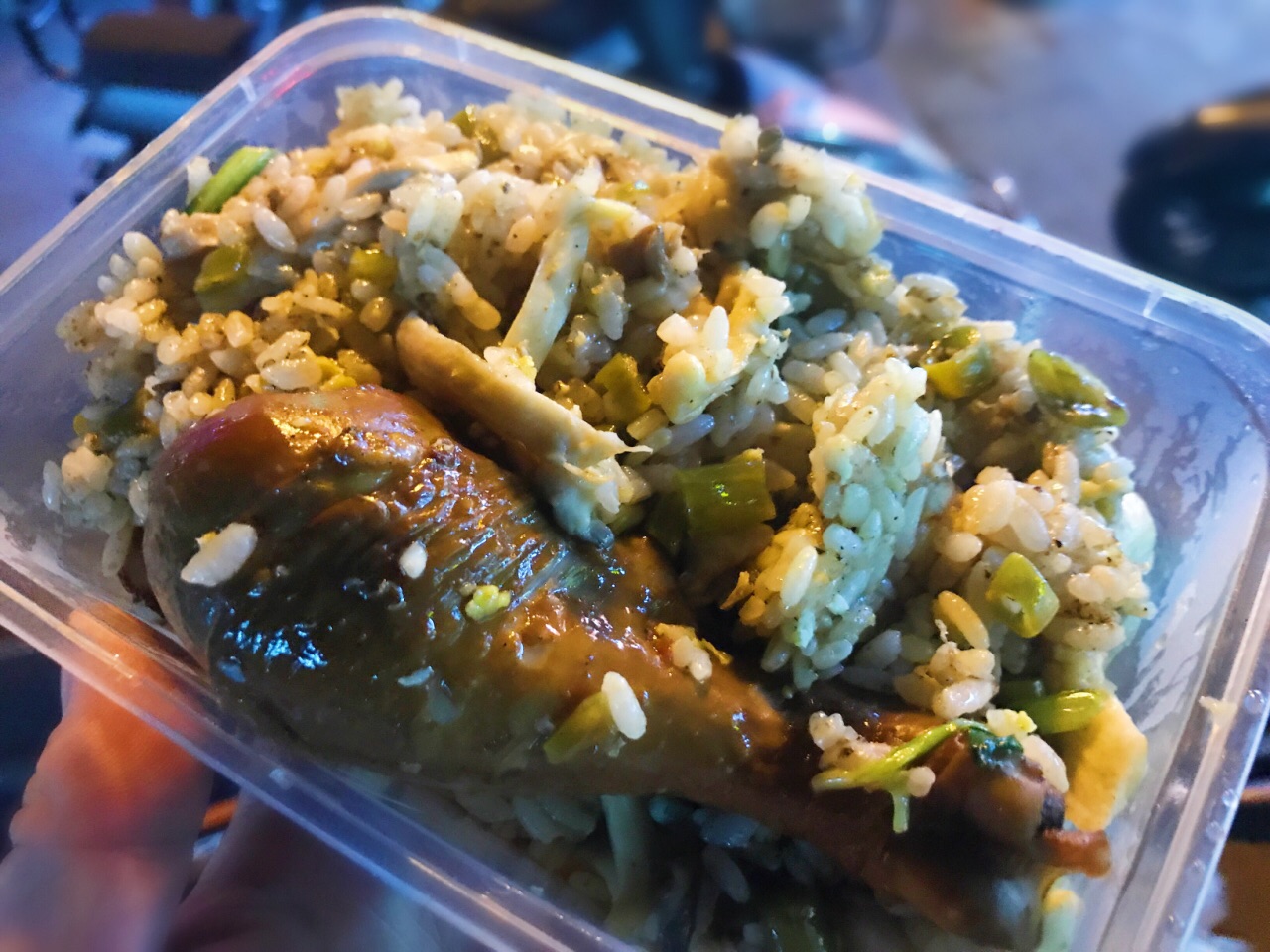 不敢吃内脏,所以选择了鸡腿,一份炒饭满满当当盛在饭盒里,在深夜,加上站立的姿势,满足感油然而生...