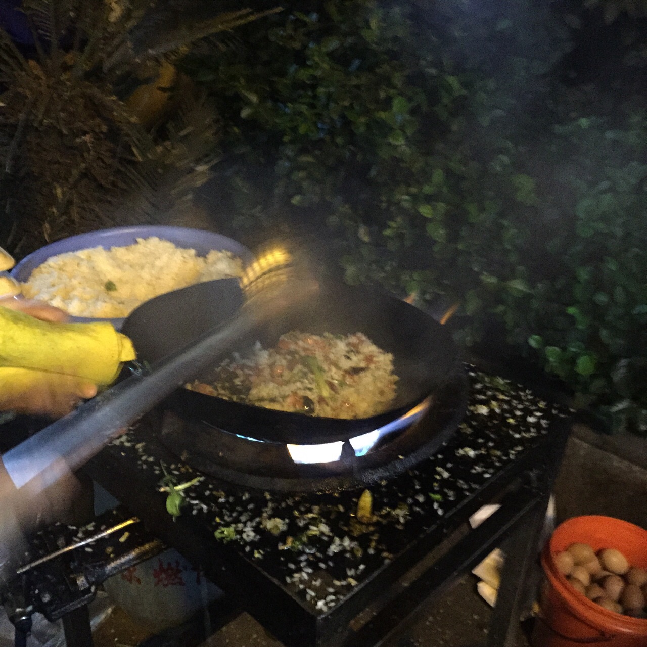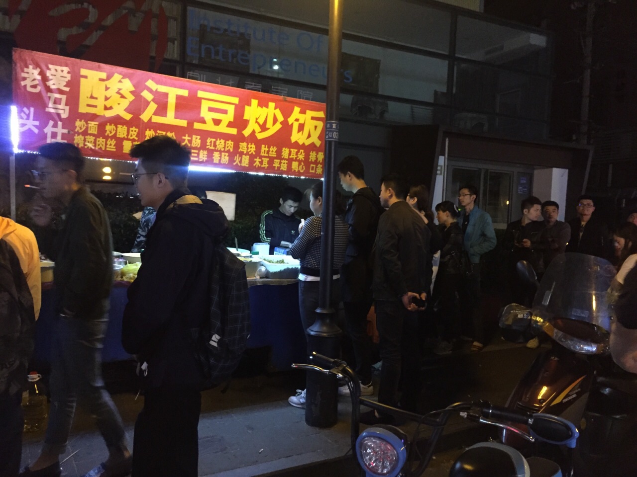 四月南京 | 老头爱马仕豇豆炒饭 夜宵,深夜里的饿意会给食物增加一二分的好感度,这就不奇怪为什么一个炒饭会火爆至极了。离得近,摩拜着赶到时用最快的速度加入队伍,虽不至于像黄老太那样一眼望不到个头,但在深夜,南京的新街口附近横着不少专程过来的私家车,还有摩拜或者步行至此的人,几个人一块炒,速度并不慢,提前选好了口味之后炒饭也就近在眼前了。不敢吃内脏,所以选择了鸡腿,一份炒饭满满当当盛在饭盒里,在深夜,加上站立的姿势,满足感油然而生,味道嘛,谈不上多么好吃,但就着排队又站着享用这股热乎劲儿,又怎能不说它是深夜饿魔们温暖的慰藉呢? 有实体店,但总有些人爱着夜摊儿。