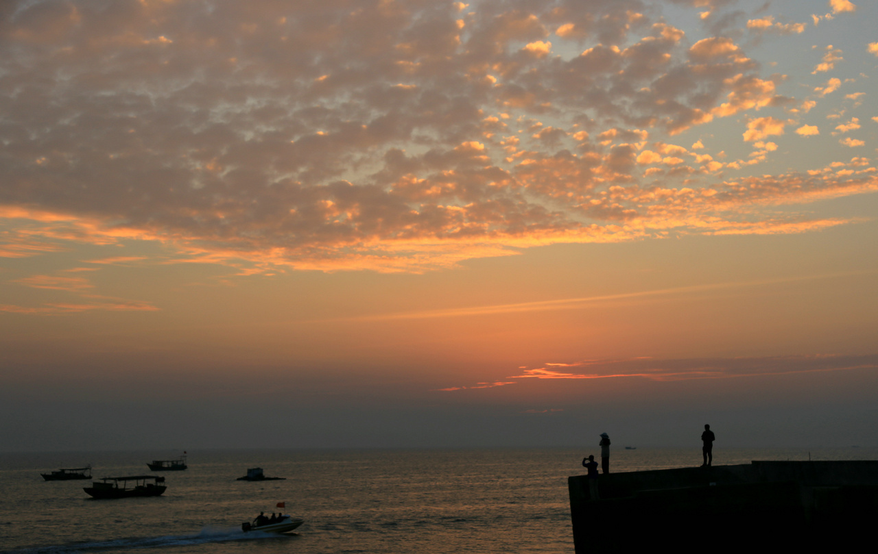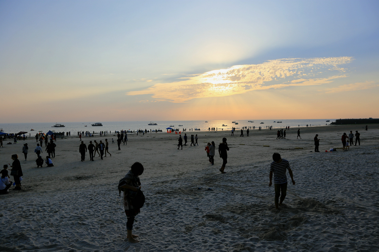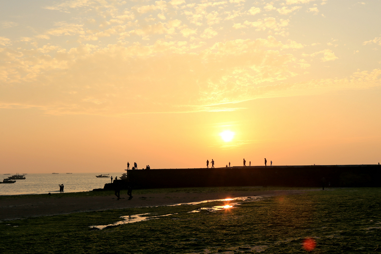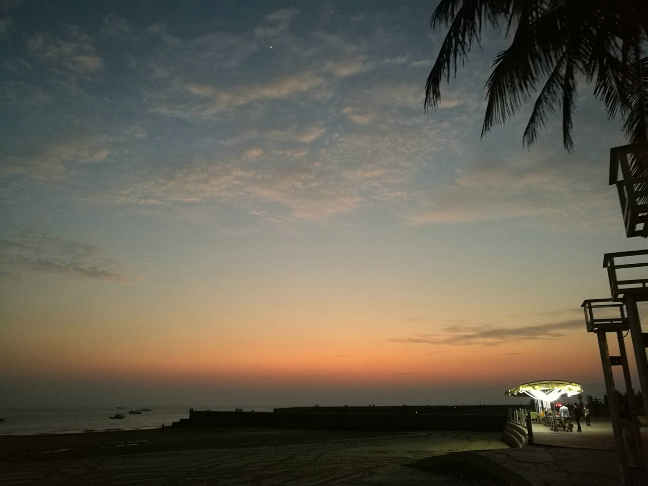 当夕阳逐渐西沉,海面金光一片,我们在堤坝上默默的看着夕阳完全沉入海中,直至把天边的云彩也染红,冬日的太阳比较温柔,火烧云的出现只有那么短短的一刻,不过让我惊喜的是之后的天空反而显得更加湛蓝透彻,在太阳的余辉中,月亮高挂,星星闪烁,淡淡的云彩漂浮,洁白的沙滩更是还留有阳光的余温,我们都不忍离去,坐在沙滩上又逗留了半个小时,直到夜色完全笼罩。