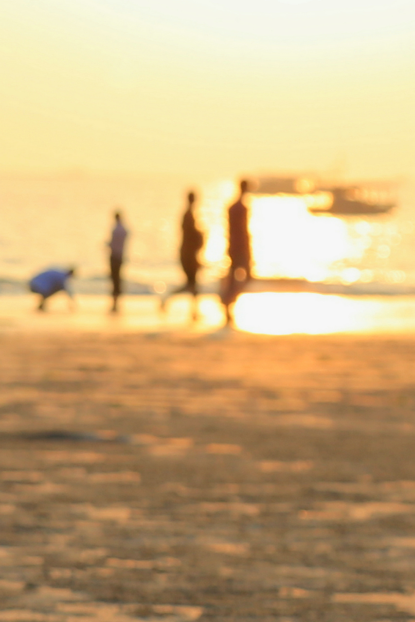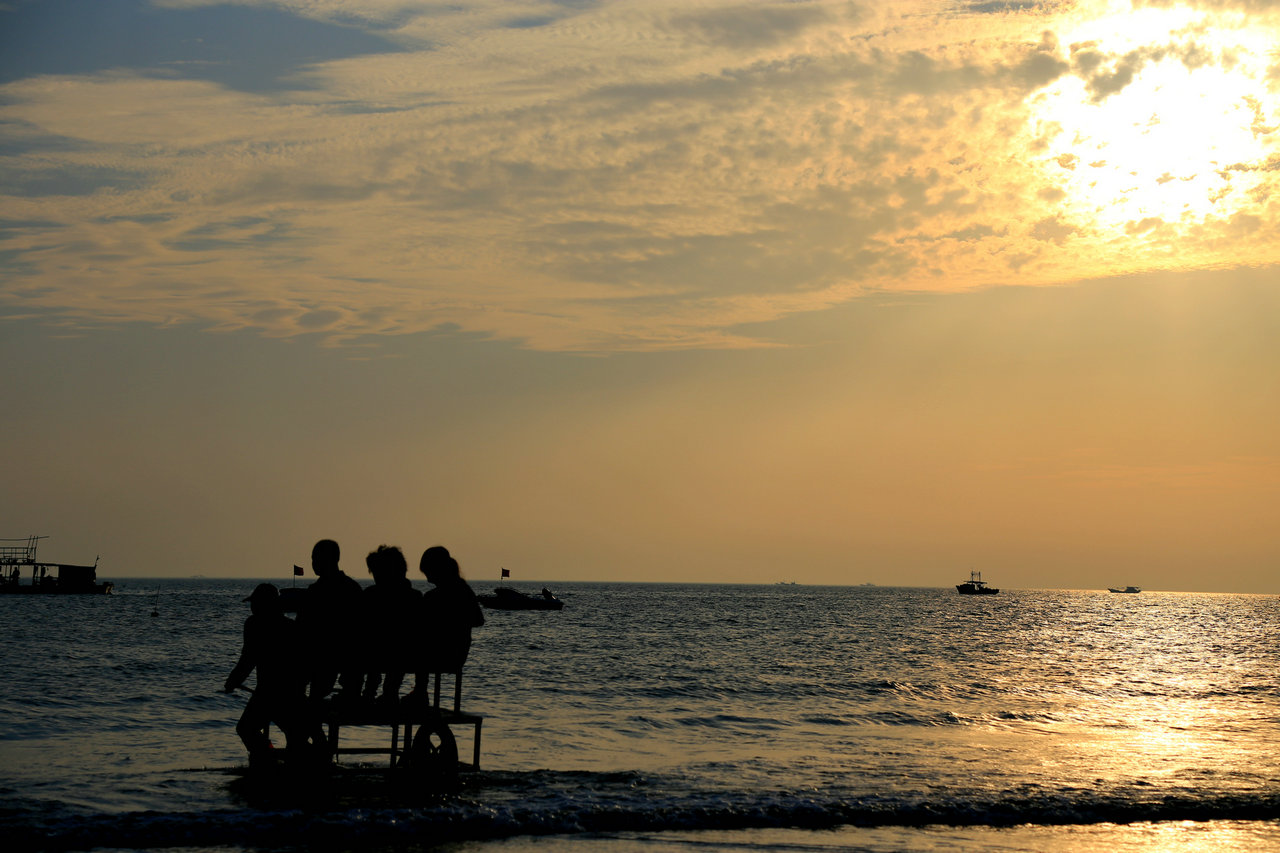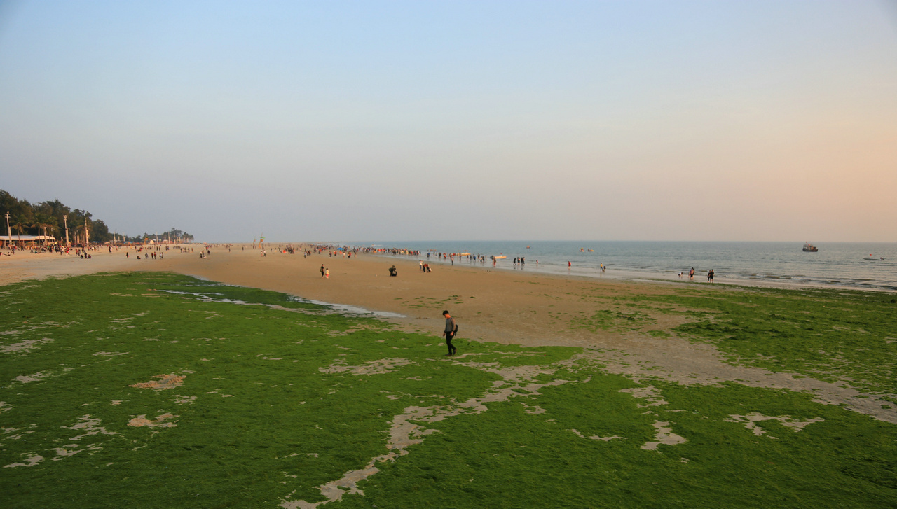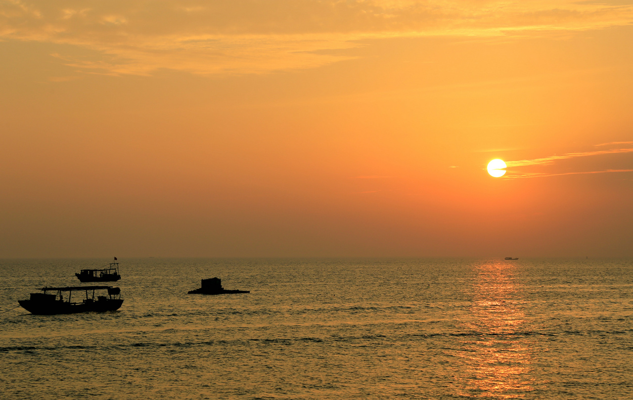 当夕阳逐渐西沉,海面金光一片,我们在堤坝上默默的看着夕阳完全沉入海中,直至把天边的云彩也染红,冬日的太阳比较温柔,火烧云的出现只有那么短短的一刻,不过让我惊喜的是之后的天空反而显得更加湛蓝透彻,在太阳的余辉中,月亮高挂,星星闪烁,淡淡的云彩漂浮,洁白的沙滩更是还留有阳光的余温,我们都不忍离去,坐在沙滩上又逗留了半个小时,直到夜色完全笼罩。