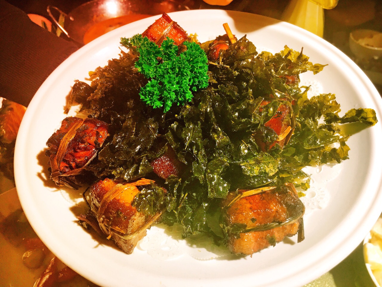 特色菜是山楂鱼头、话梅排骨:椒麻鸡和芥末虾。位于天竺法净寺对面,茶园之中花朵拥簇的文艺餐厅
