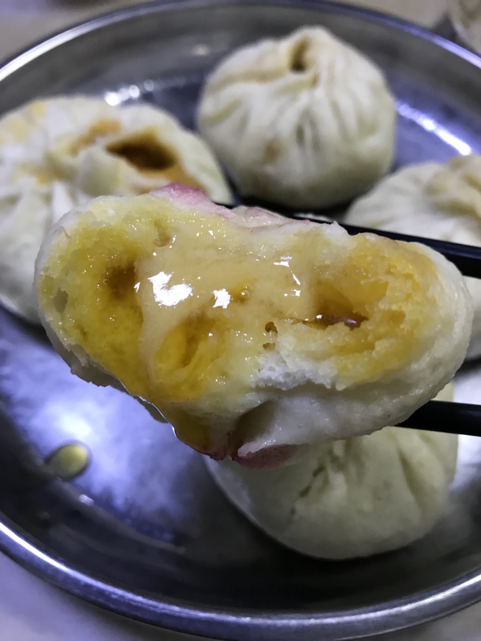包子里有一整颗完整的蛋黄,口感不干,很神奇~还是喜欢正宗的。咬开的瞬间,流沙很诱人