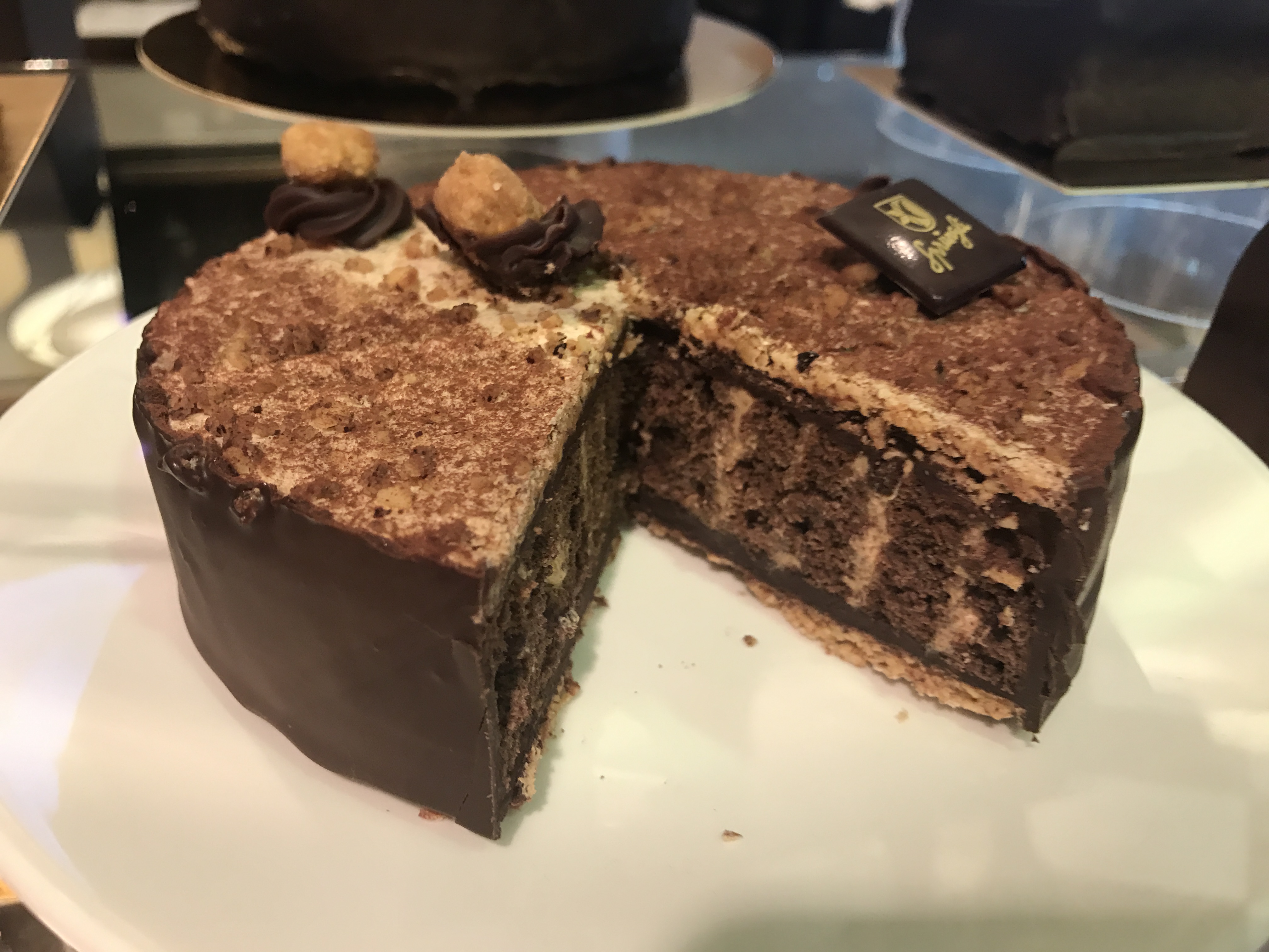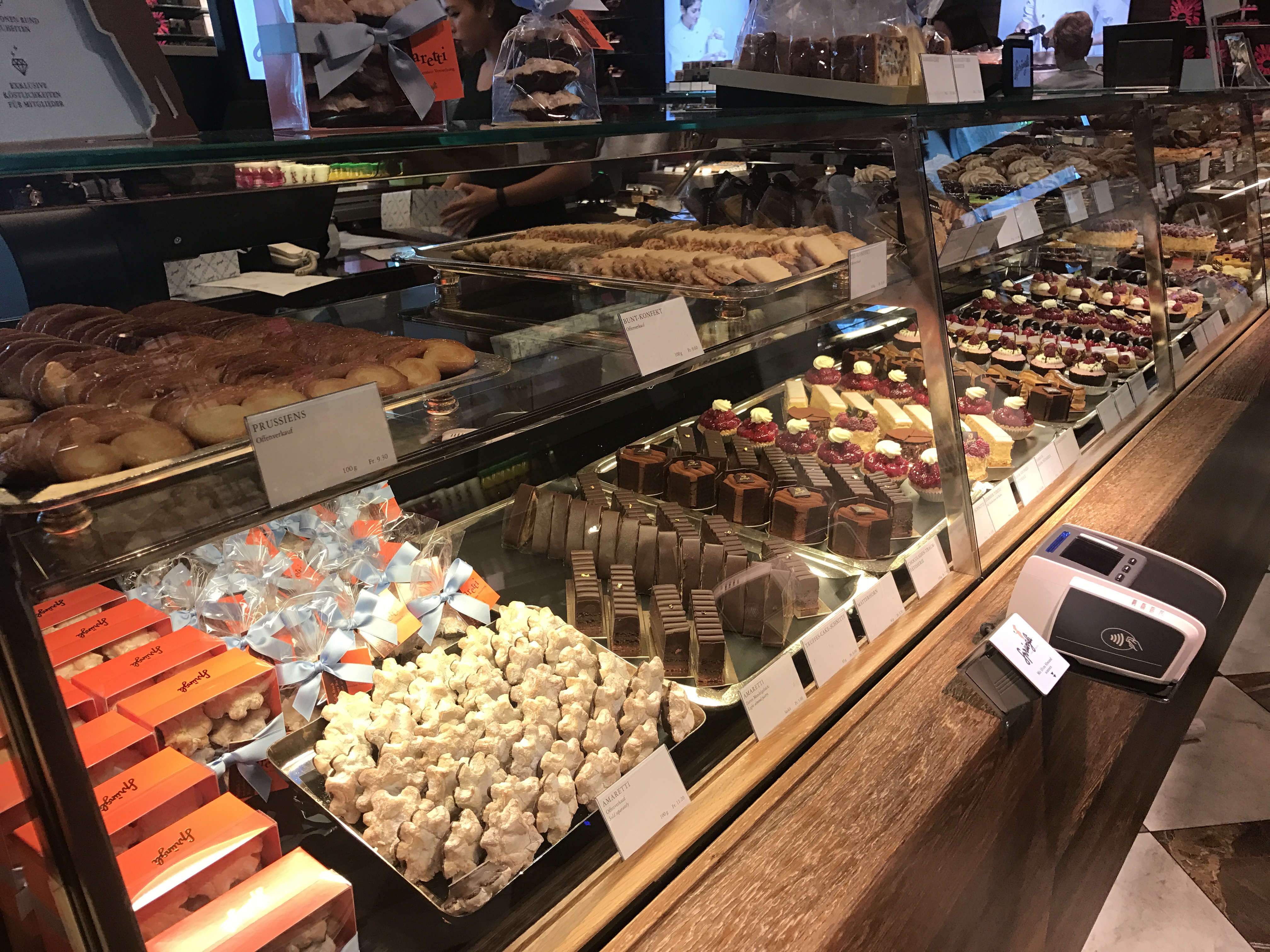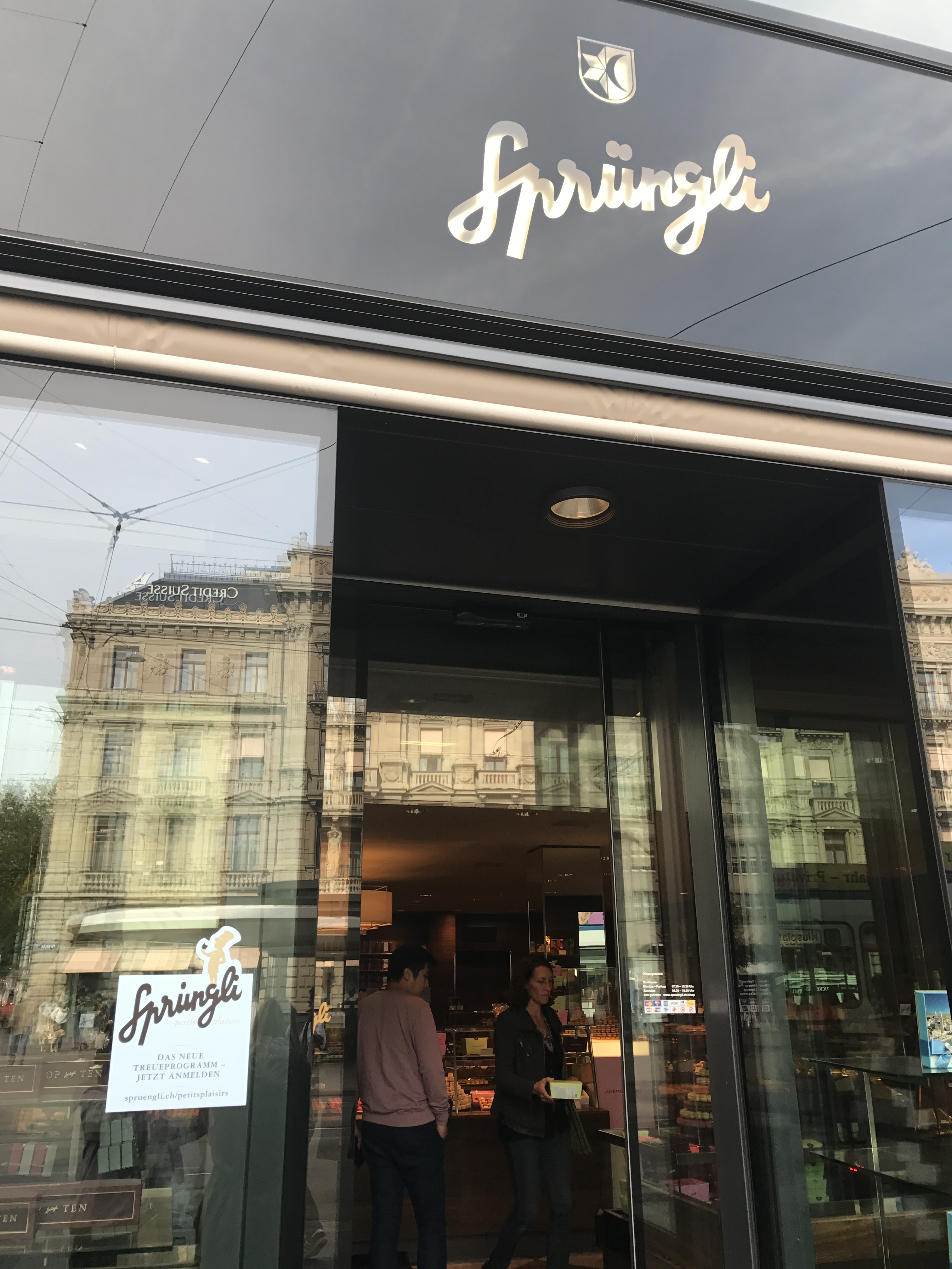 网评分很高的甜品店,于是进去看看。 本人很喜欢甜品,老婆很不喜欢甜品,居然也被深深地吸引了。 接待本人的工作人员是个东方脸,原来是日本人,还会说一点点中文。 她说,这个瑞士非常有名的甜品店。 果然大气,有工作人员在制作巧克力可以试吃的,是一颗颗送的,不像国内是切成很多很小块然后试吃的。 味道不错,果断买了不少。