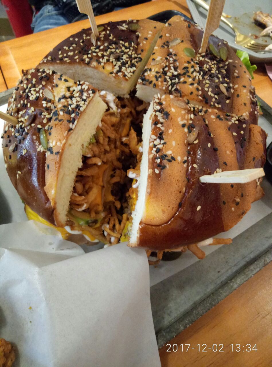 开业不久的超级大汉堡店~~分三个尺寸双人餐118六寸的汉堡,四人餐是八寸的,会问切成几份 服务态度呢特别好,就是排队人太多辣,等的有点久