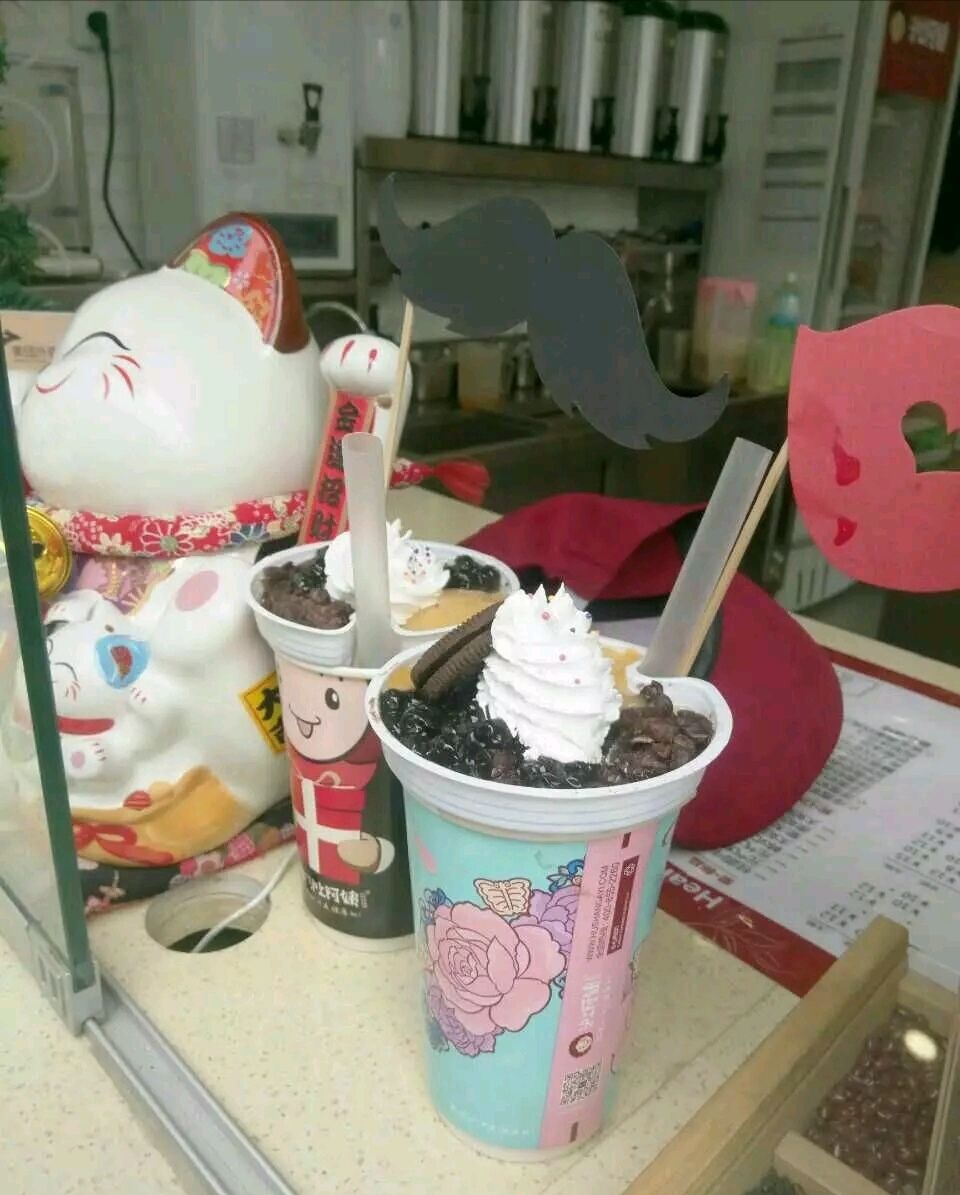 店内装饰干净明亮,只有外卖窗口,只能打包外带。菜单上和其他奶茶店差不多~~ &血糯米奶茶& 点了招牌的血糯米奶茶,只能说它和上海的估计只有“阿姨”两个字是一样的。奶茶的味道单薄,没有浓厚的香味。奶精和甜味充斥,血糯米不少,不过煮的过头,太软没有糯米的韧劲了。口味一般般。