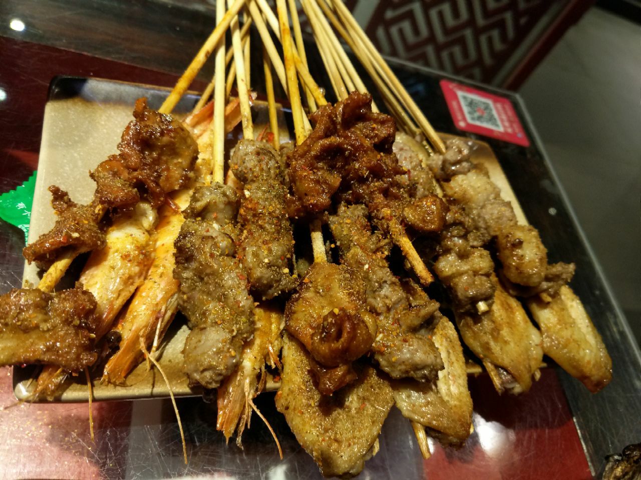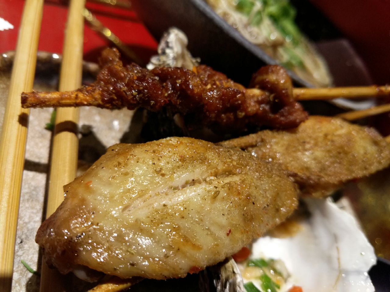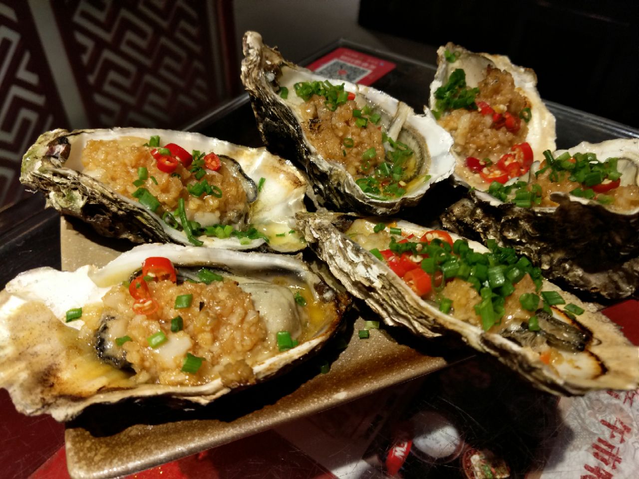 昨晚带着父母又去这家店吃了,人不多,环境还可以,服务也还可以,烤物的口味很不错,点了半打生蚝,生蚝个头挺大,肉质嫩,蒜蓉味道挺香的。烤鸡翅调料风味不错,鸡翅大小正好,不是那种个头特别大的,大的反而吃起来不放心了,烤鸡翅风味挺好。老妈蹄花的汤很有营养,有芸豆,蹄花干净很不错。烤羊肉串稍稍偏油了,烤牛肉好吃,烤基围虾味道也挺好。九鼎鱼挺辣的,里面还有粉丝,量足,比以前有改良,不错。牛肉面比以前有改良,不像以前辣辣的口感,很好能接受,也吃的下去。